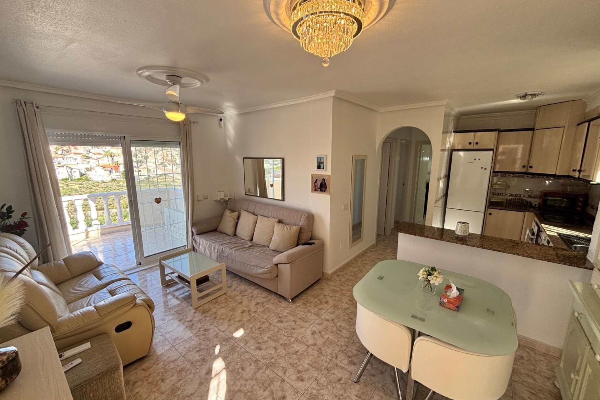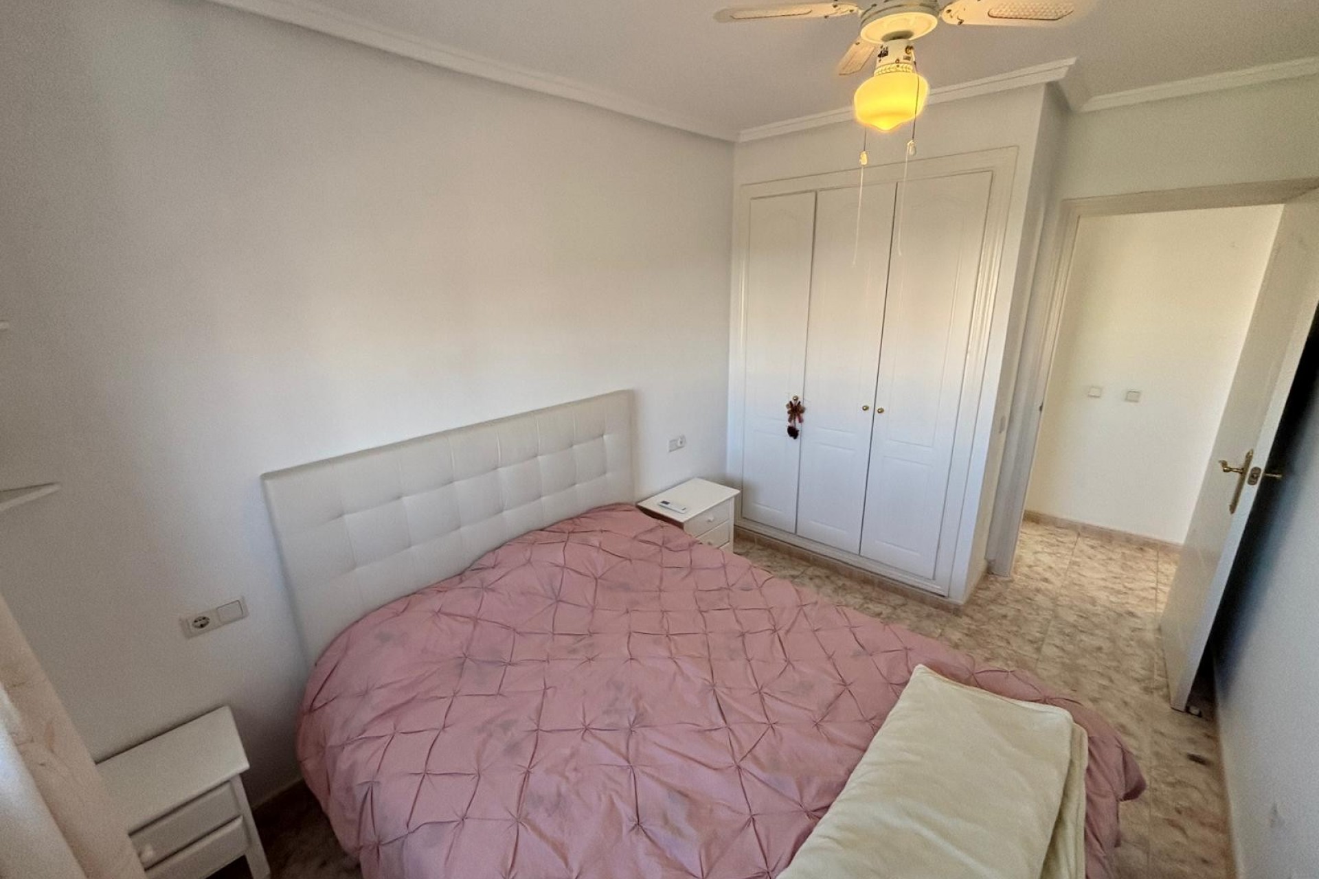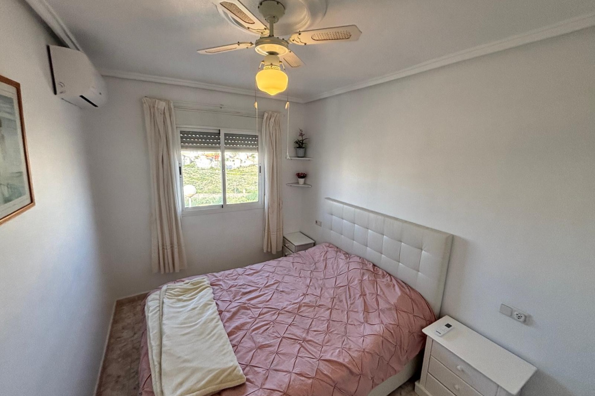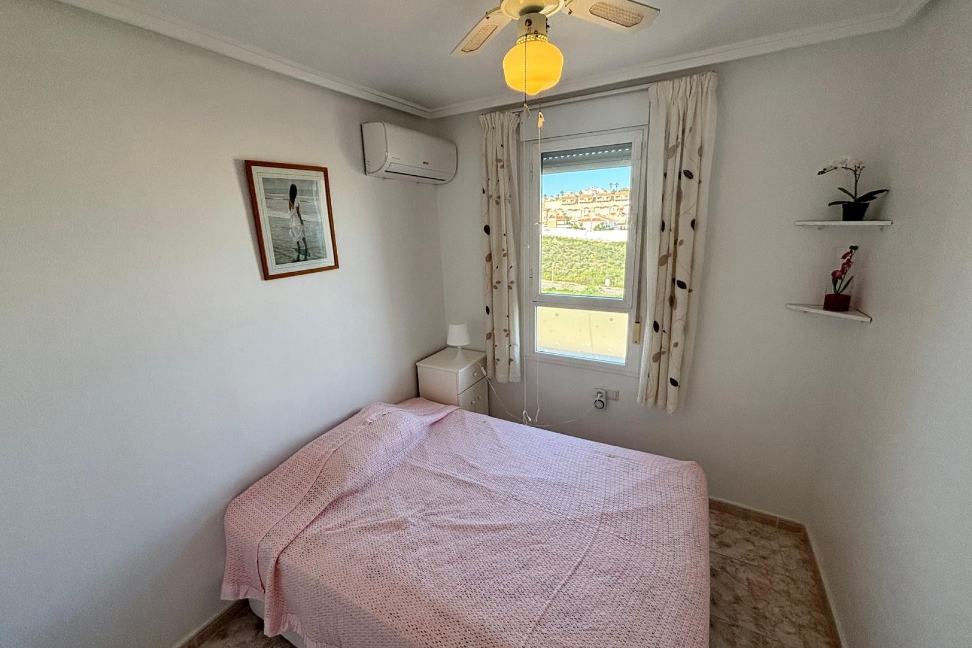 We are pleased to off this top floor buena vista style apartment with views towards the golf. The apartment offers 2 bedrooms and a shower room lounge and open plan kitchen. The front balcony with view’s leads to the private solarium which then has even better views there is also a storage room this was going to be converted by the current owners. The property is in very good condition includes air-con and fans and comes furnished. there is off street parking and a storage room , handy for bikes etc, The community pool is only a few minutes walk away.
