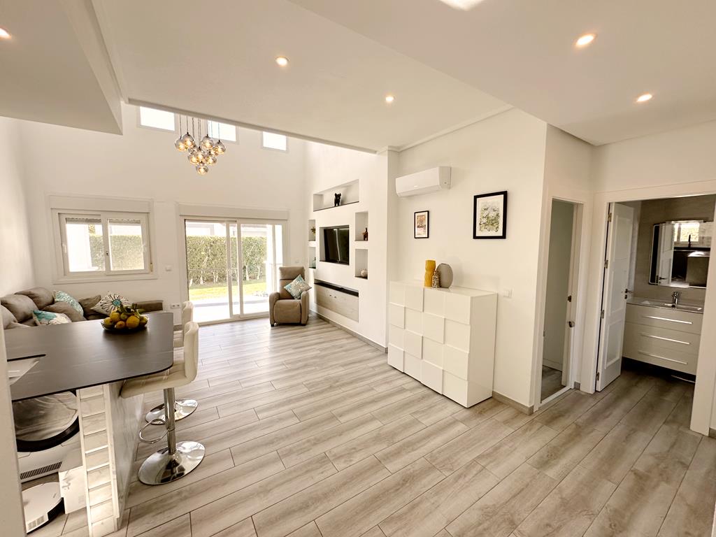 This villa must be seen to appreciate the upgrades the current owner has done. It is simply stunning and we are excited to offer this fully modernised Acebuche villa for sale on the wonderful La Torre Golf Resort. No expense has been spared with this property. The owners have extended the entrance area, added a storage room upstairs, fully retiled the solarium and added frosted privacy glass, opened up the living space with a brand new kitchen, new bathroom, rear tiled terrace with covered pergola and outdoor kitchen area, a huge shed (the perfect man cave!) and all new floorings and aircon throughout. The garden has plenty of space to add a private swimming pool. The property is situated close to the Kings College entrance of the resort and close to one of the communal swimming pools. Murcia airport is ten minutes drive along with the local village of Roldan. Onsite you have a supermarket and various bars and restaurants in the resorts town centre.