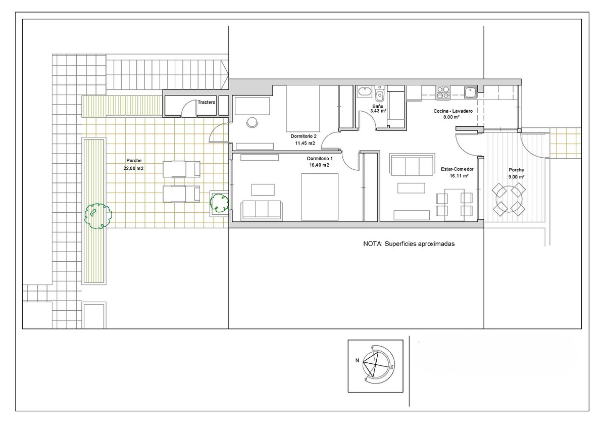 The property offers 58 m² of built space along with a spacious 22 m² rear terrace designed as a private garden, perfect for enjoying the Mediterranean climate all year round. There is also a charming front porch that adds comfort and privacy to the home.