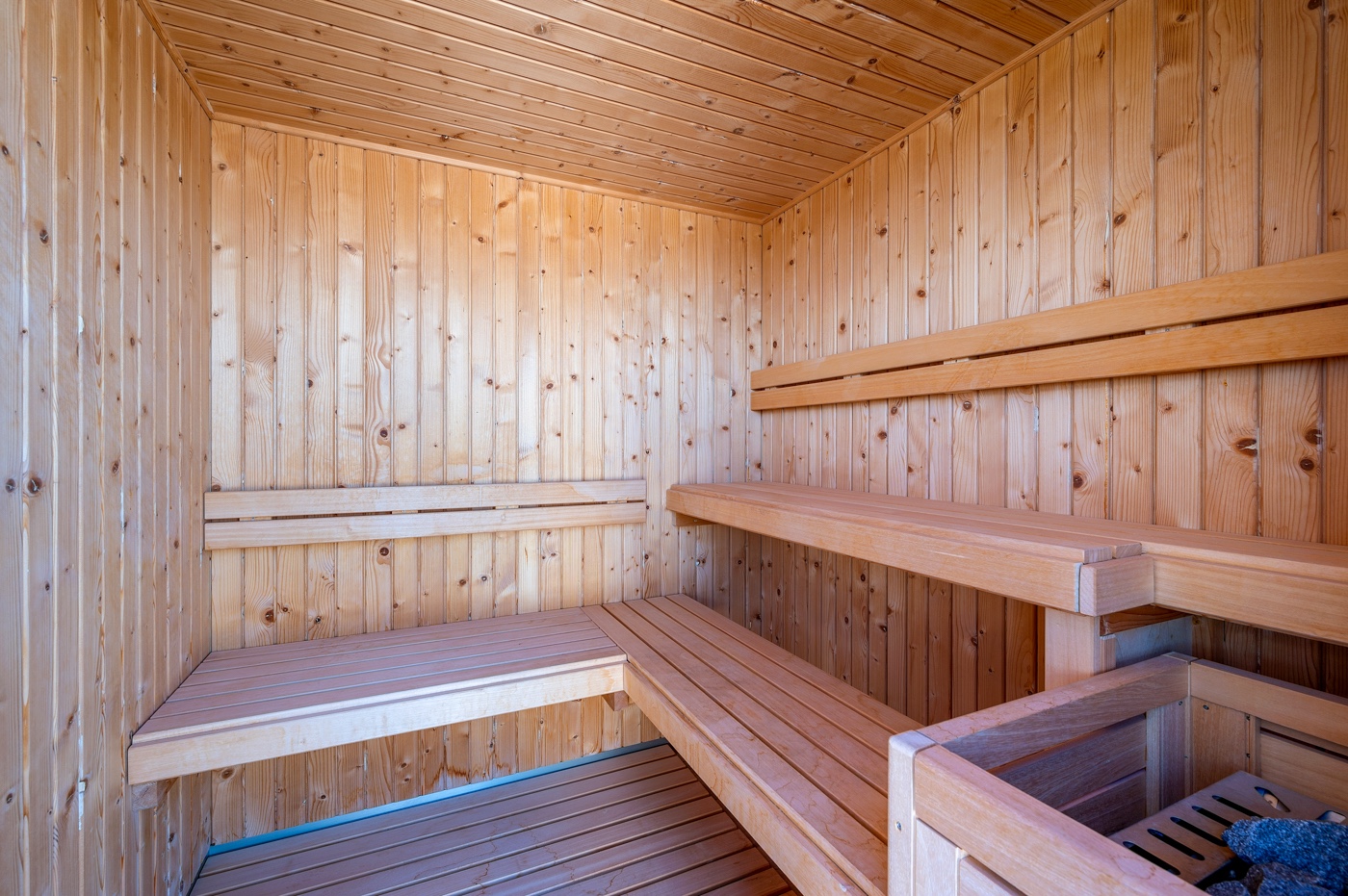 The rooftop features a communal area with a 3 x 8 m outdoor pool, sauna, open-air gym, relaxation zone with loungers, and an outdoor kitchen with barbecue.