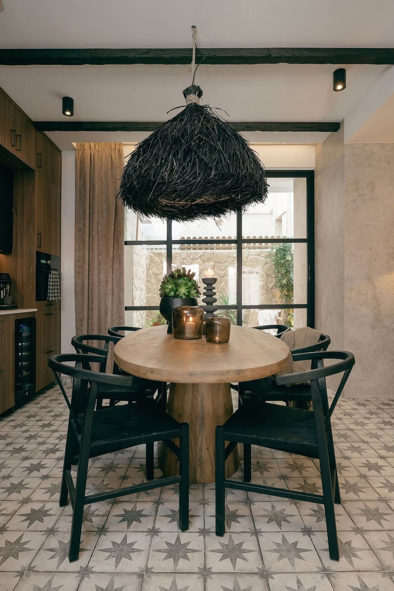 The kitchen is separated from the patio by elegant industrial-style sliding doors. On warm summer evenings you open it up and extend the dining room out.