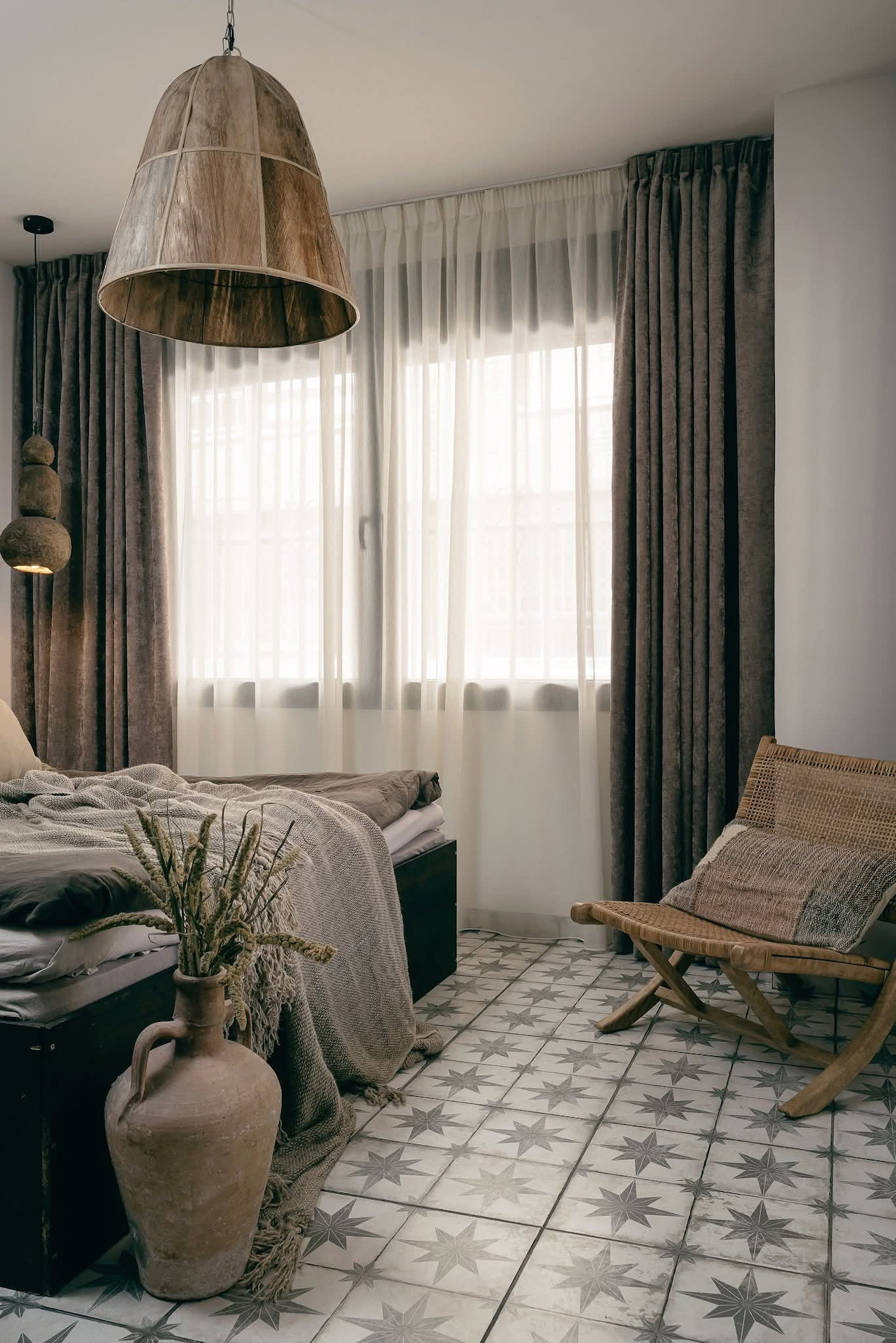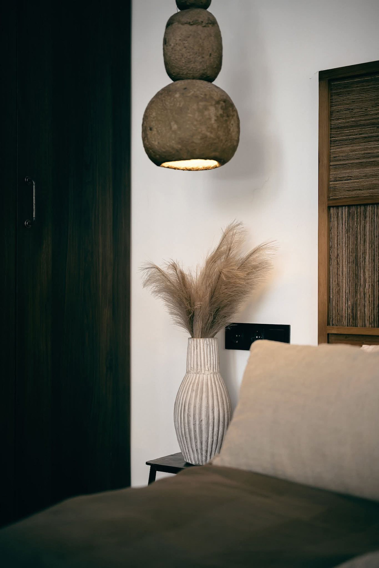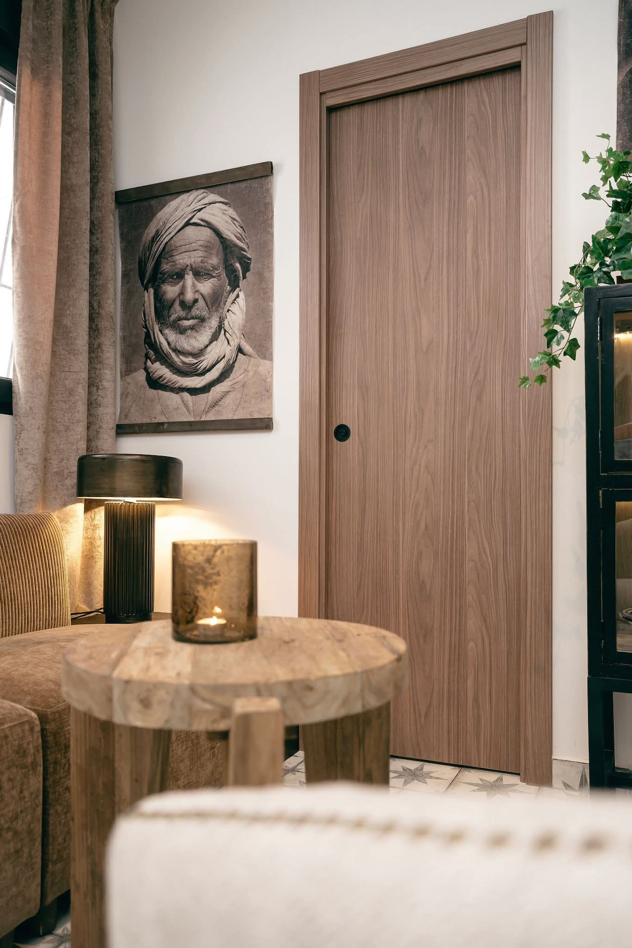 The living room with an exclusive sofa, wool rug and a vintage TV stand has access to the front terrace.