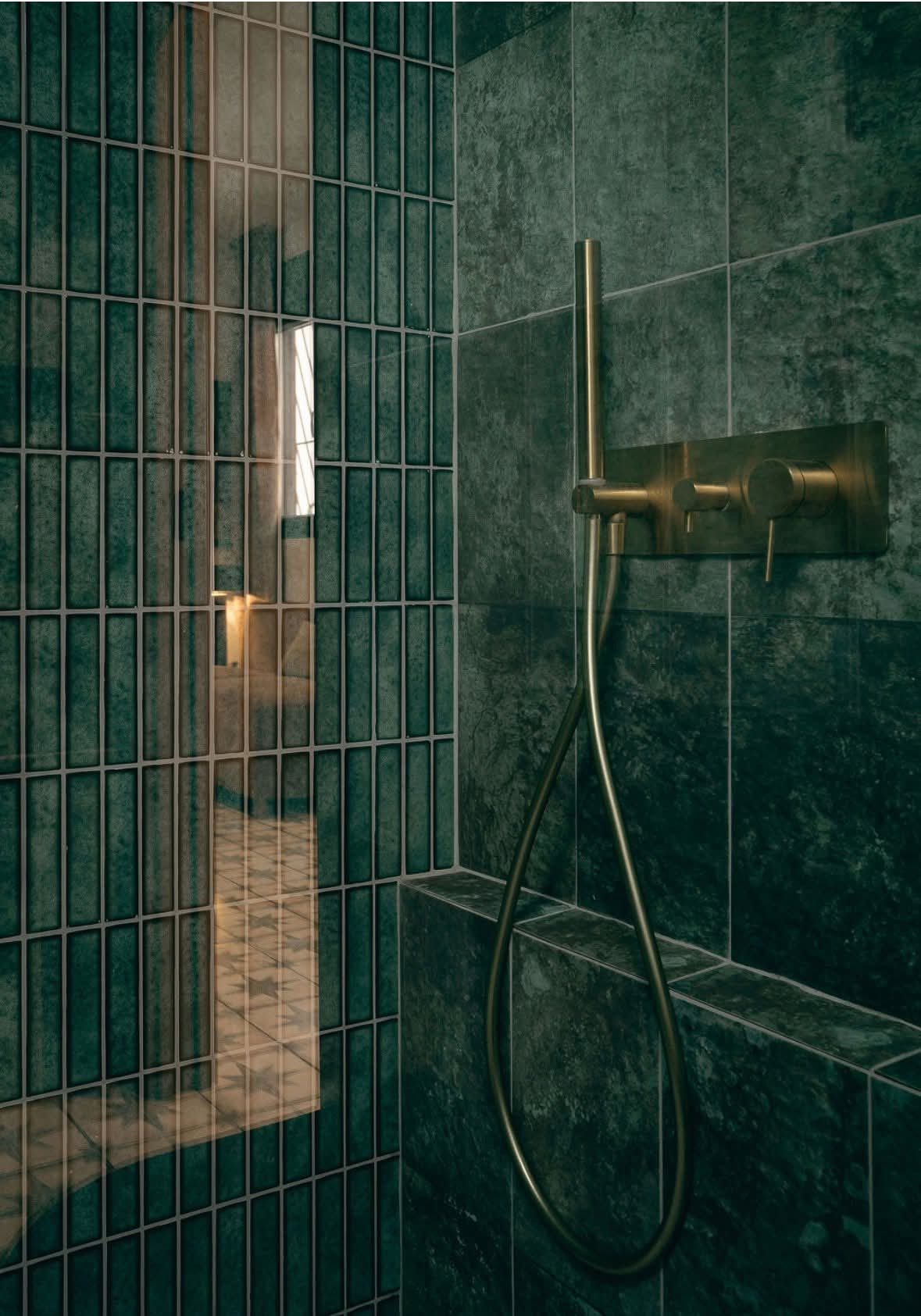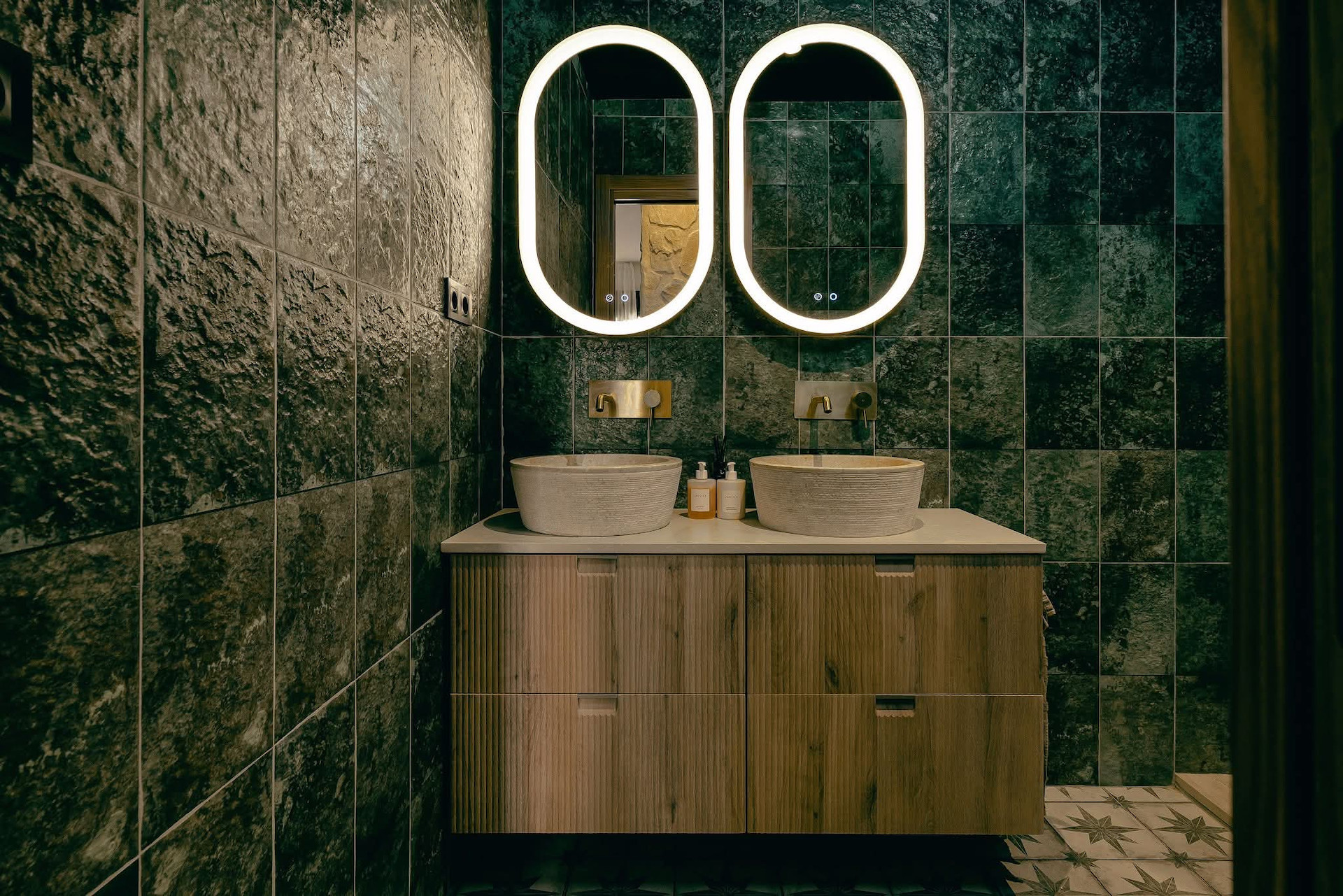 Two bathrooms with green emerald-like tiles complementing stone sinks and exclusive taps. The largest bathroom has double sinks.