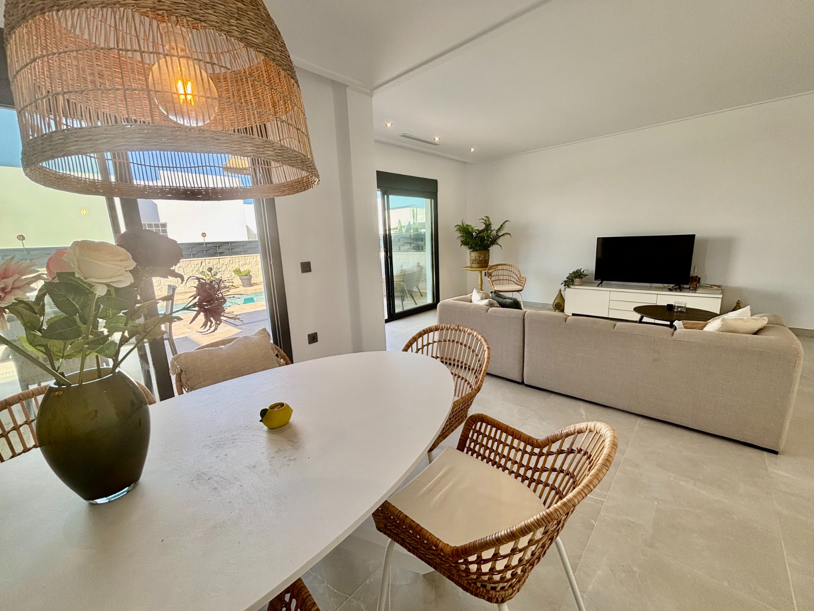 This Modern, East and West Facing, Two Bedroom Detached Villa in Benijofar is located within a highly sought-after area on the Costa Blanca South, just a 2 minute walk to many local amenities and facilities, with supermarkets close by and only a 12 minute drive to the nearest beautiful beaches. This stylish and contemporary property features a fully fitted open plan kitchen with a breakfast bar, a bright and light lounge/dining room with access out to the front tiled garden and terrace. The dining area on the ground floor can easily be converted back into the third bedroom as it originally was. There are two double bedrooms — one on the ground floor and the other on the first floor with an en-suite shower room & solarium — both benefitting from fitted wardrobes. The property also includes two modern, stylish walk-in shower rooms, offering comfort and practicality throughout. Air conditioning is installed in the lounge and all bedrooms, ensuring year-round comfort. The private solarium boasts an outdoor kitchen, ideal for entertaining, while enjoying open views across the surrounding area, countryside, mountains, and those spectacular sunsets. Outside, the villa offers a private swimming pool with a built-in seating area, off road parking, and a useful storeroom in the front garden. This beautiful modern villa perfectly combines elegant design with everyday convenience, providing a superb opportunity for full-time living or as a luxurious holiday home on the Costa Blanca South.