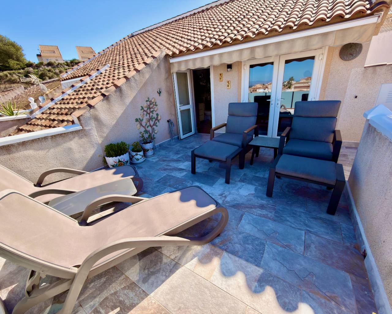 The villa features a bright, functional layout with a fully equipped kitchen, a utility room, and spacious living areas that open onto a private, glazed terrace overlooking the garden. Both bedrooms include built-in wardrobes: one on the ground floor and the master on the top floor, with its owner’s roof terrace. The home benefits from air conditioning and ceiling fans throughout for year-round comfort.