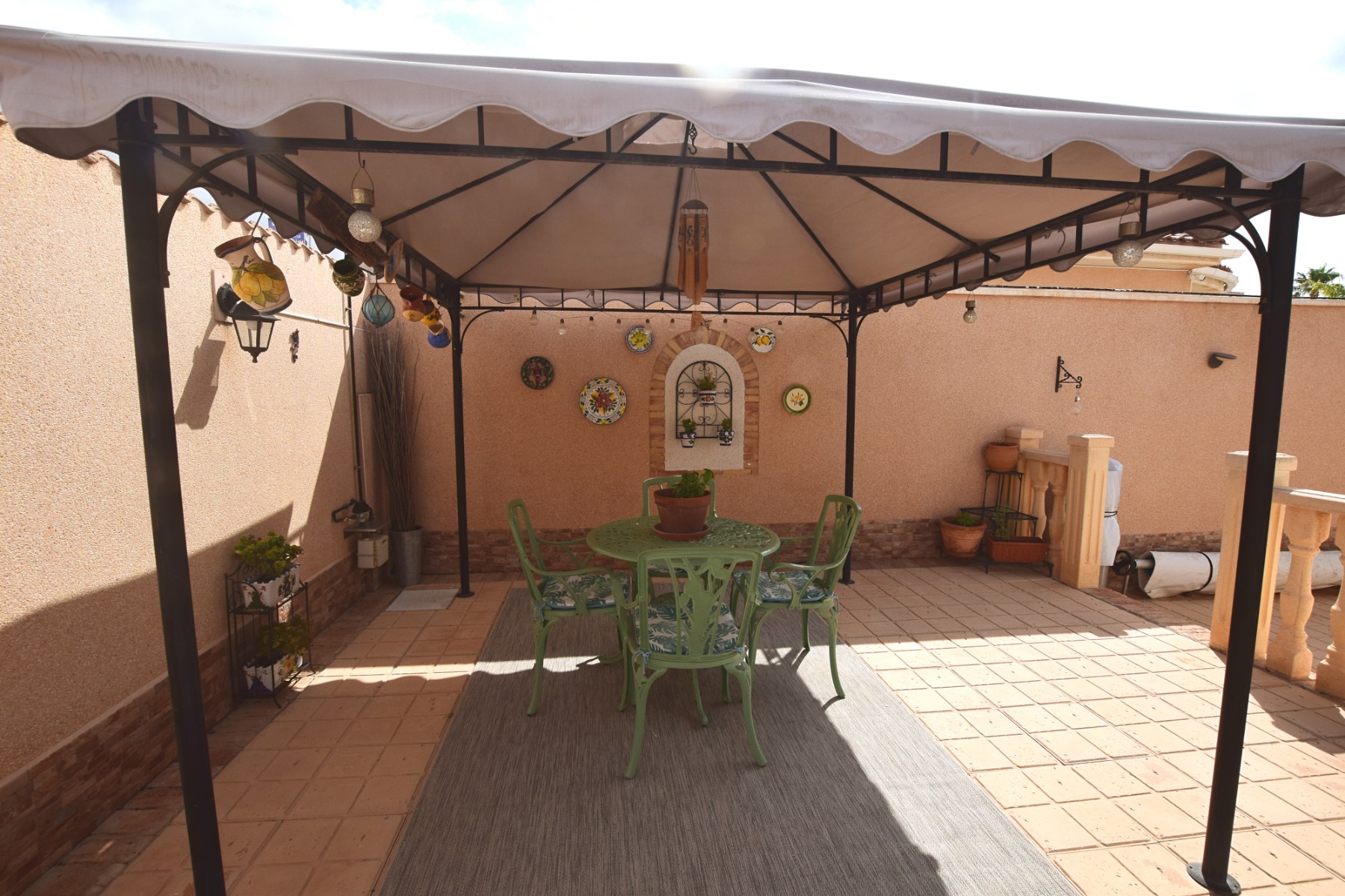 The villa’s main door opens from the dining area into a beautiful curved, classical arched Naya, fully glazed with tinted sliding full length windows. This Naya is currently used as a second lounge area on the south side of the villa and overlooking the large 507m2 plot complete with private swimming pool, a variety of seating and entertaining areas.  There is ample space for all kinds of outside activities, relaxing and dining etc.