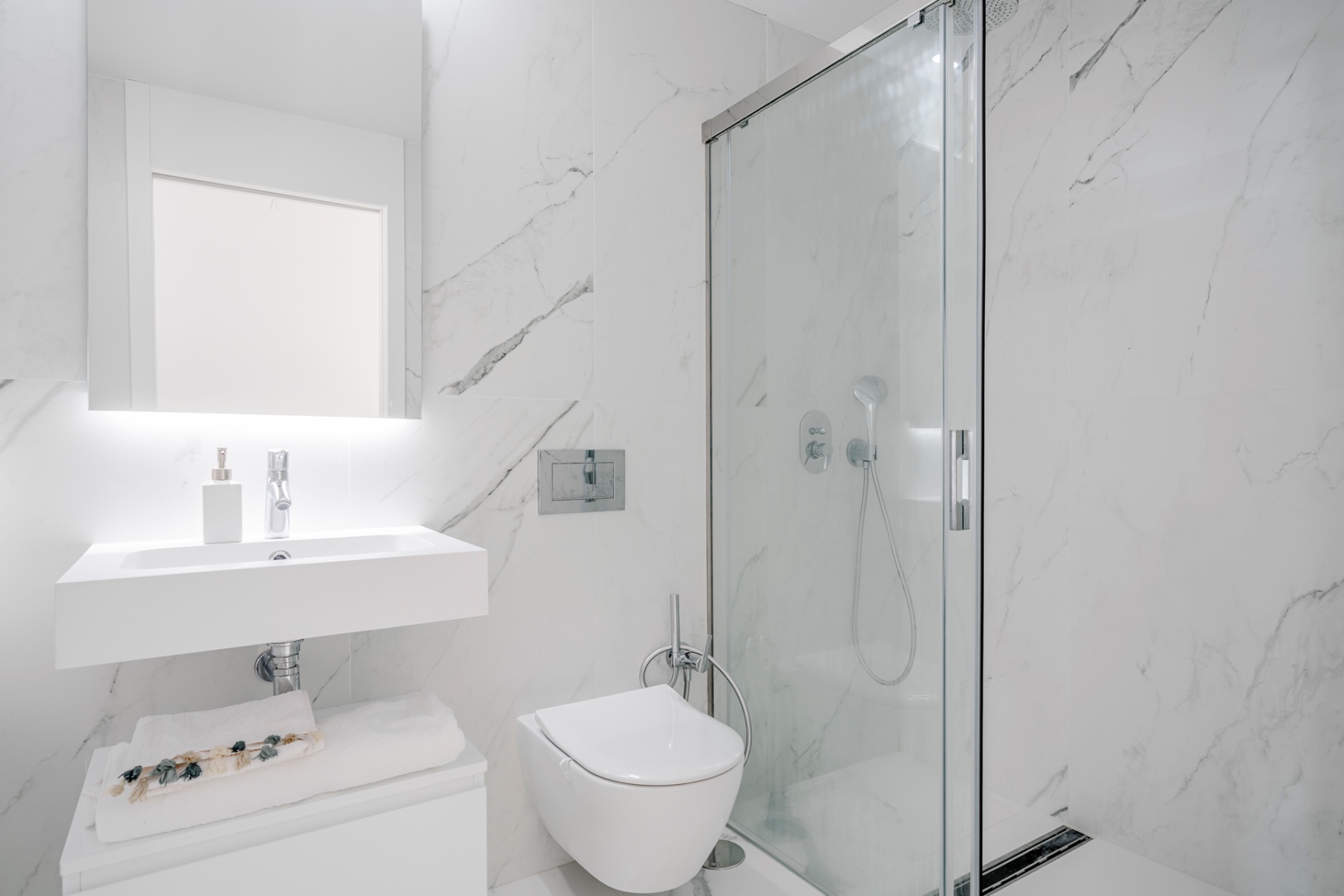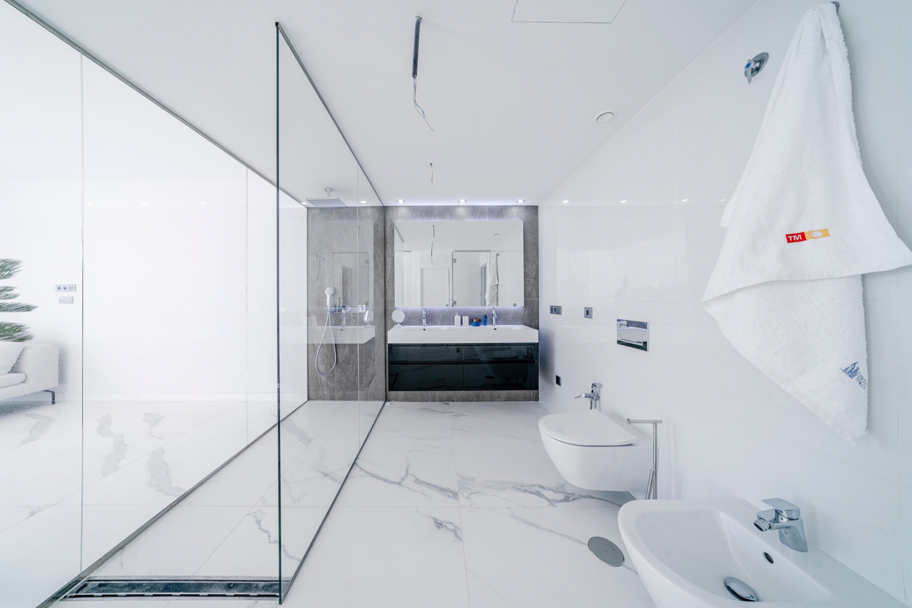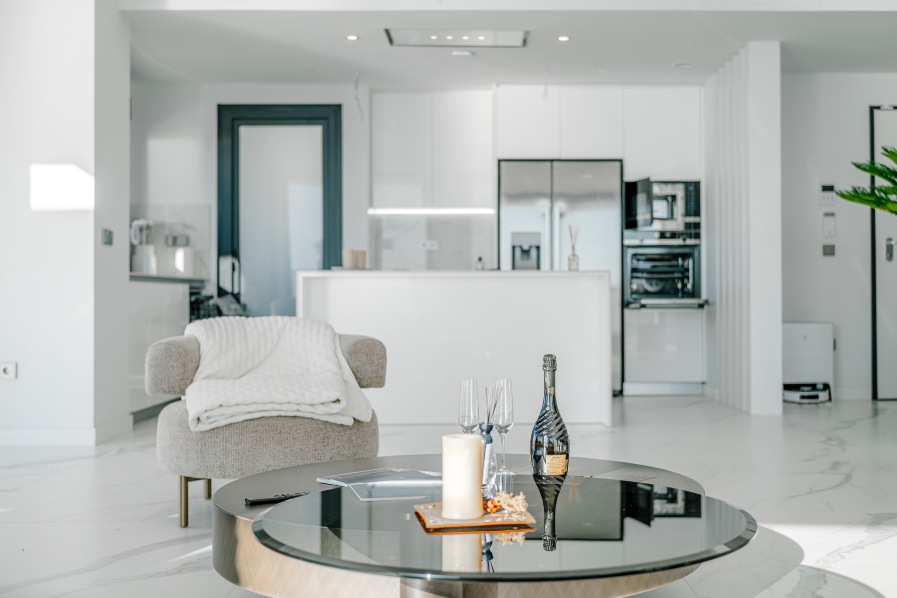The spacious living area is bathed in natural light, featuring an open-concept kitchen equipped with high-end Samsung smart appliances and exclusive Porcelanosa finishes. With its seamless design and premium materials, this space is perfect for both everyday living and entertaining.