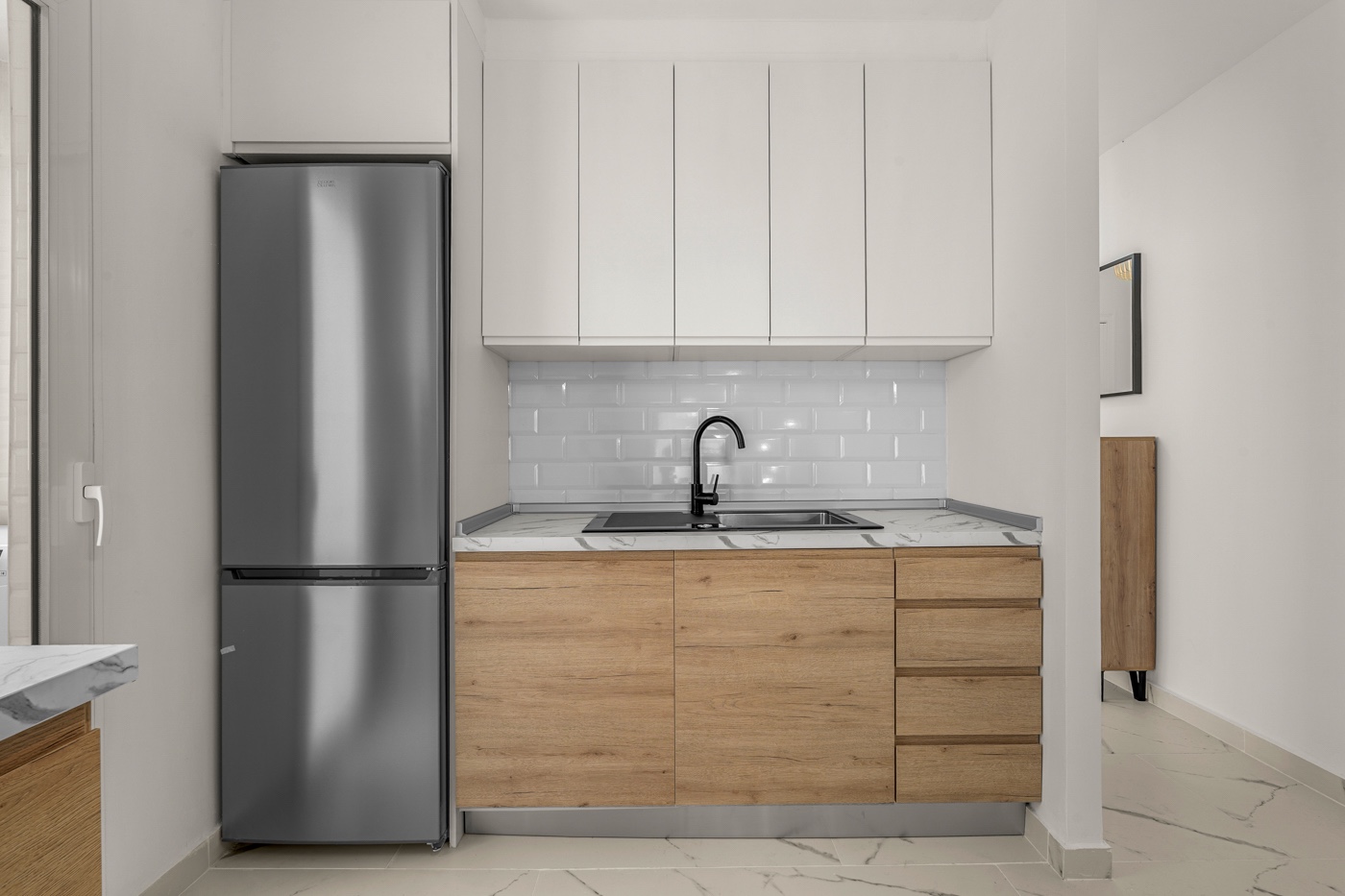 It has a modern, fully equipped kitchen with access to a convenient interior patio where the laundry area is located.