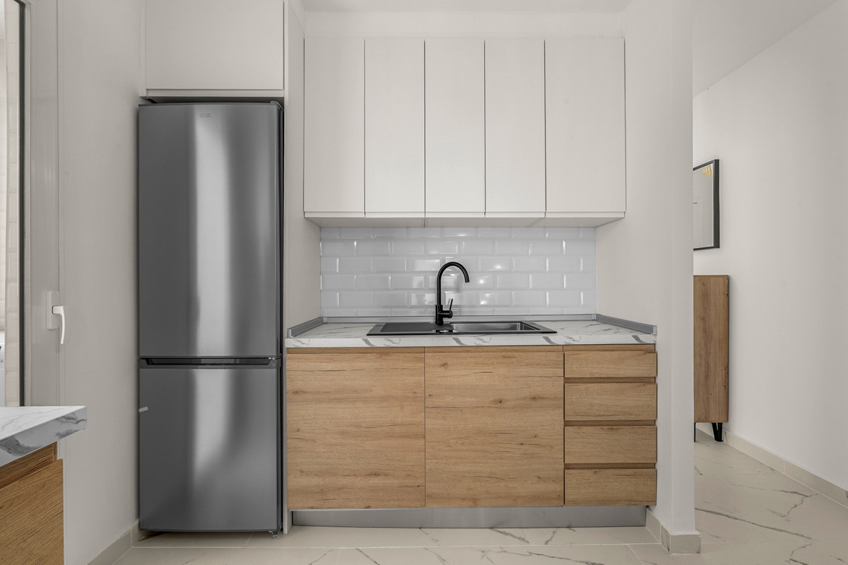 It has a modern, fully equipped kitchen with access to a convenient interior patio where the laundry area is located.