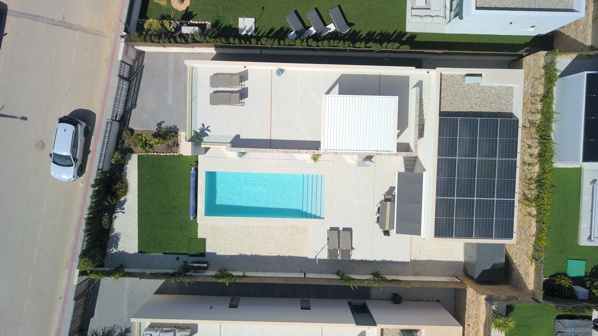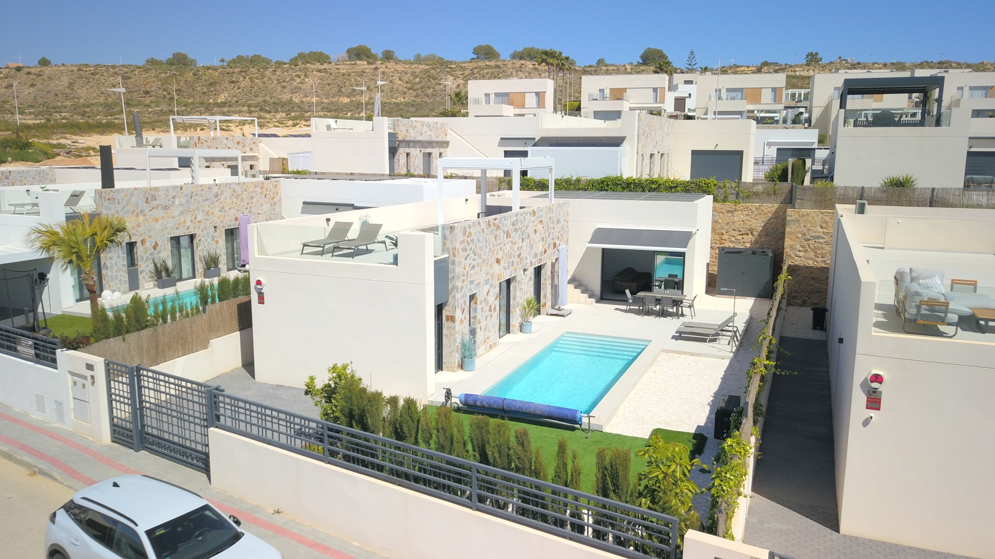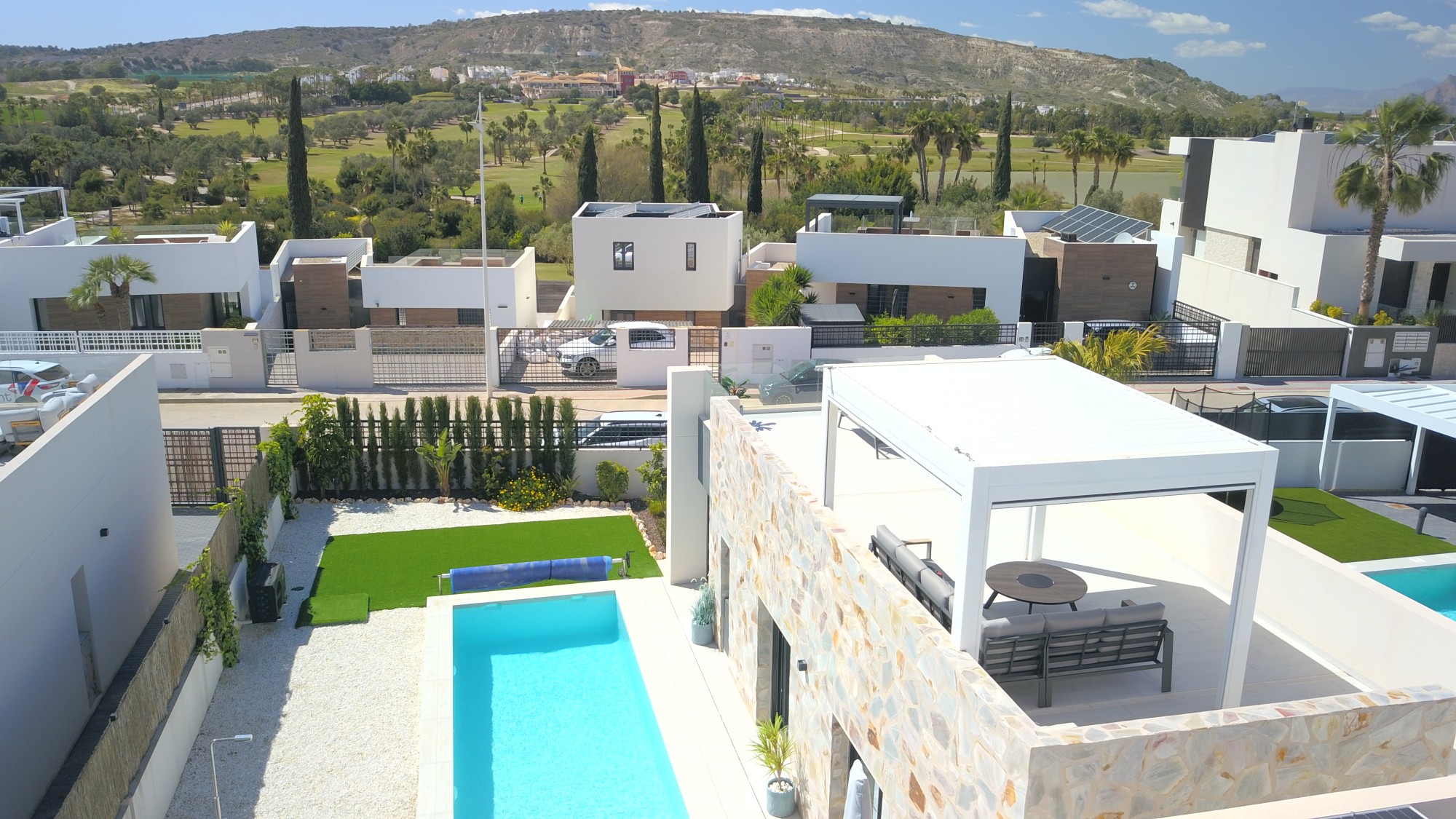 This West Facing, Three Bedroom, Detached Villa in La Finca Golf 5* spa and hotel resort is located within a prestigious setting in Costa Blanca South, just a 10-minute walk to café bars, restaurants, and shops. The nearby town of Algorfa is only a 5-minute drive, while Quesada and Benijófar can be reached in 10 minutes for further amenities, and the beautiful coast beaches are just 20 minutes away. This impeccable, modern home of 118m² sits on a 380m² plot and was built at the end of 2024 by one of the most reputable constructors in the area, offering stylish, single-level living. The spacious open plan living area features an infrared wall panel and wide sliding glazed doors with an electric sun blind, leading out to the patio and pool area. The contemporary fitted kitchen includes a breakfast bar plus there is a utility room. There are three double bedrooms, all with built-in wardrobes and direct access out to the garden, with the master benefiting from an en suite shower room, plus there is a further family shower room—both benefit from underfloor heating. Externally, there is access to a private solarium enjoying countryside and golf views, complete with a bioclimatic electric pergola with blinds on three sides. The beautifully maintained garden features artificial grass, pebbled planted areas, and a private 9 x 3 heated swimming pool (WiFi connected). Additional benefits include an electric gate for car access, solar panels which are connected to the grid, plus airzone ducted air conditioning throughout, making this a truly exceptional property.