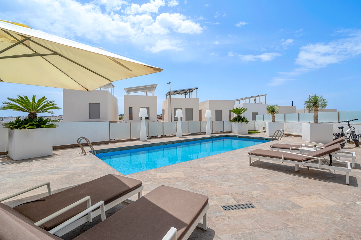 The outdoor area boasts a private pool, easy-maintenance garden areas, a covered terrace ideal for outdoor dining, and a pergola-covered dining space with artificial grass. The large rooftop solarium offers additional relaxation space. The property also includes on-site parking with a covered carport.