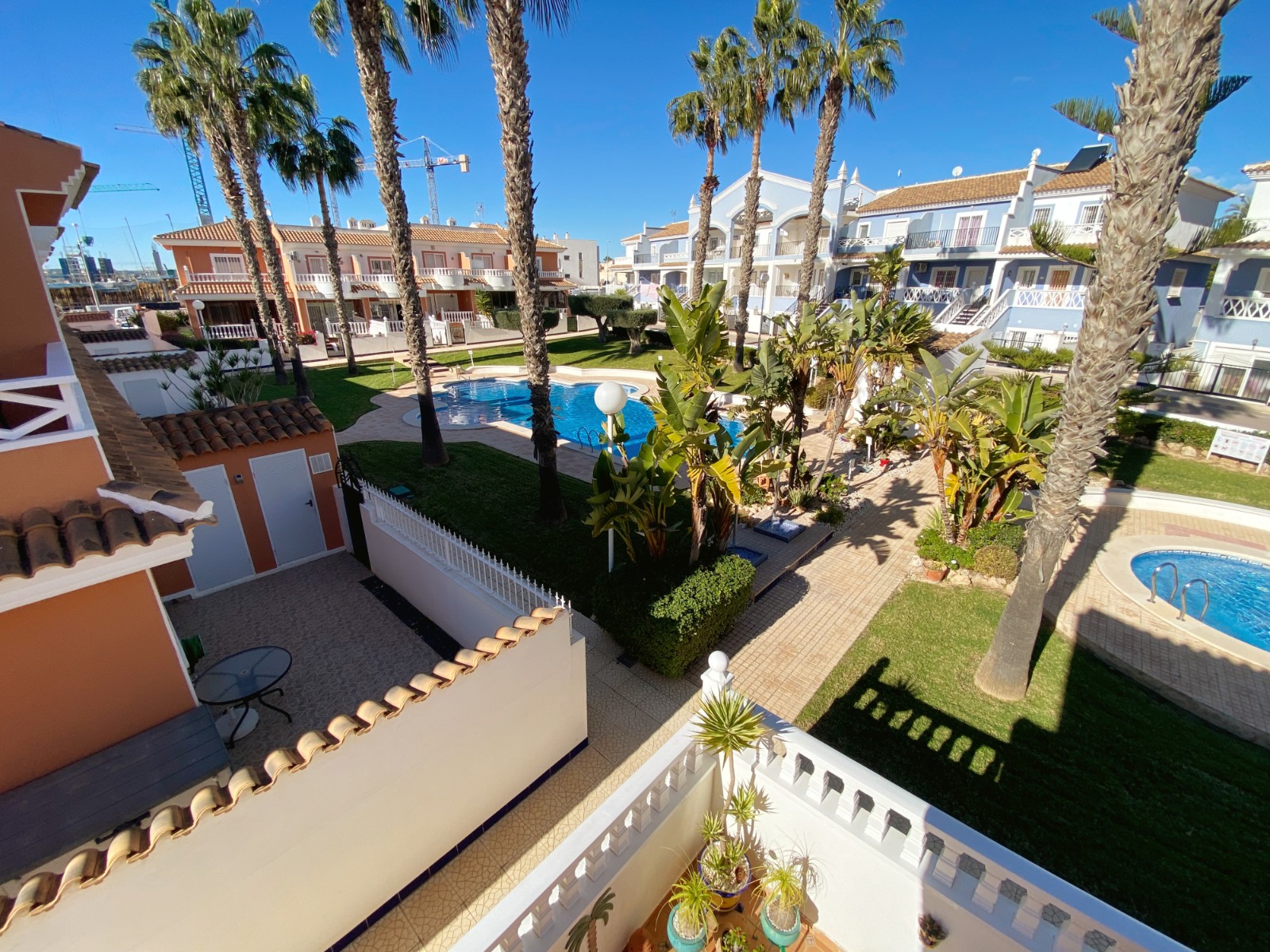 The next door opens into a double bedroom at the rear of the property with a private balcony overlooking the communal gardens and pool. The last door opens into a large bright double master bedroom with patio doors to a large front terrace overlooking the park area and onto to the salt lakes. The view is excellent.