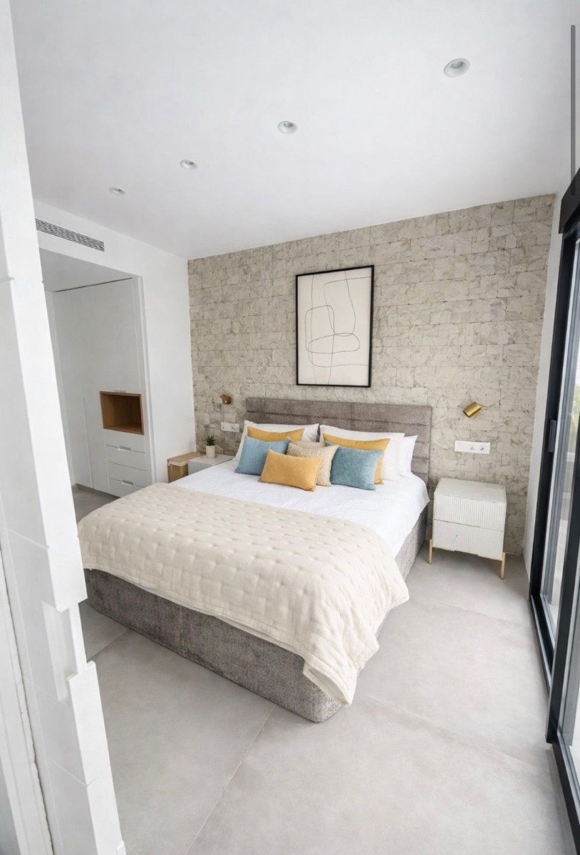 This West Facing, Three Bedroom, Semi Detached Villa in Santiago de la Ribera, is located just 950 metres from the beautiful 4km stretch of beach, lined with a fantastic variety of café bars and restaurants. Originally a charming fishing village, this area now offers a wonderful blend of tradition and modern coastal living. Main chain supermarket is conveniently close by, while San Javier town and the popular Dos Mares shopping centre are only a 5–10 minute drive away. Excellent road connections via the AP-7 and N-332 make travelling along the Costa Blanca South effortless. Built in 2025, this exquisite 143m² villa offers outstanding contemporary design and comfort. The open plan living space is bright and spacious, featuring wall-to-wall glazed doors that open directly onto the garden and pool area, creating a seamless indoor–outdoor flow. A glazed door from the dining area leads to a lovely private patio. The fitted modern kitchen with central island provides an elegant and functional cooking space. On the ground floor, you will also find a cloakroom and a double bedroom with an en-suite shower room and access to a front garden terrace. The first floor comprises two additional double bedrooms, each with walk-in wardrobes and access to a spacious terrace. The master bedroom benefits from its own stylish en-suite shower room. Both shower rooms throughout the villa are beautifully designed with double sinks, walk-in showers and underfloor heating for added luxury. From the first-floor terrace, steps lead up to the impressive 48m² private solarium, partially laid with artificial grass. This fantastic space is perfect for relaxing or entertaining, complete with an outdoor kitchen area that can be enclosed, integrated outdoor speakers, and views over the municipal garden. The property includes Airzone air conditioning, mosquito blinds, two automatic awnings, and a front tiled garden with access to the garage. This is a truly exceptional modern home in a prime coastal location on the Costa Blanca South.