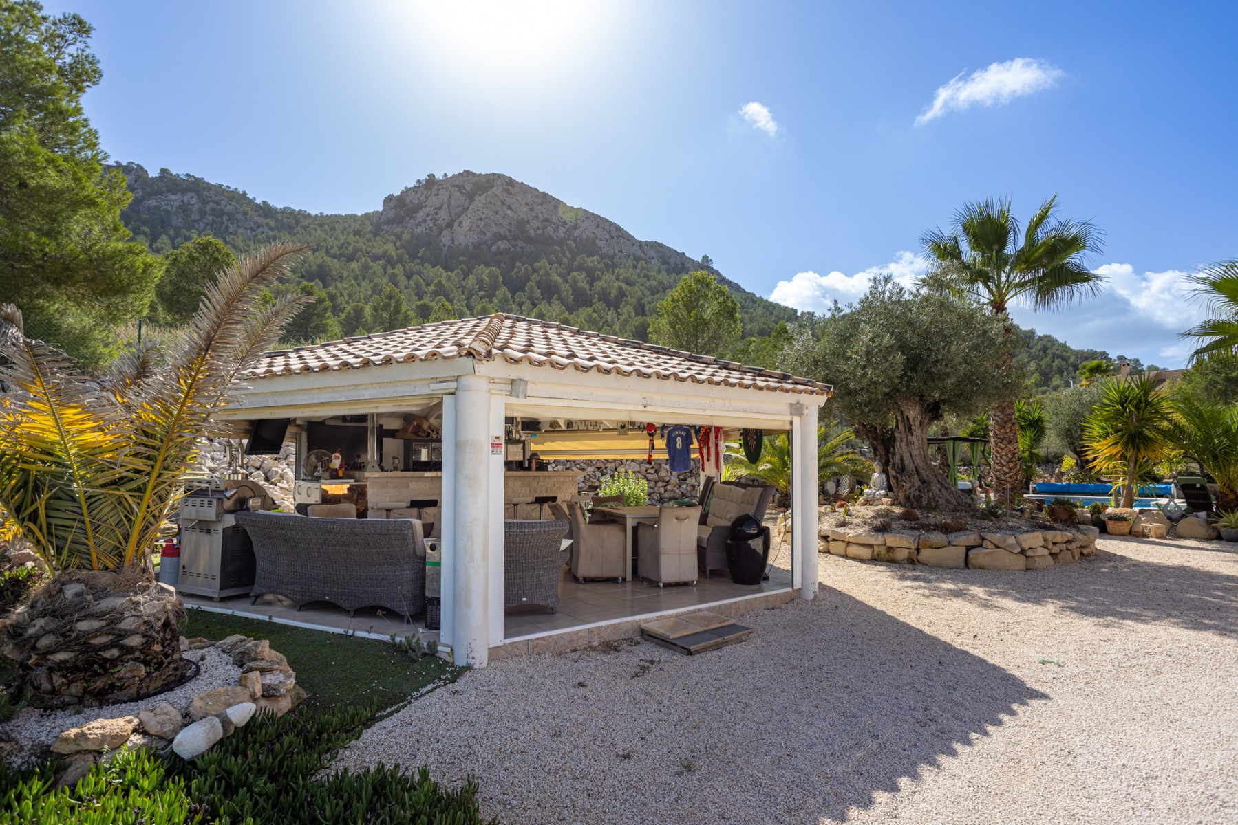 The meticulously maintained garden leads to a fantastic private swimming pool, ideal for cooling off in the summer, but also heated for cooler winter days. It also features a barbecue area, a covered veranda perfect for al fresco dining, a large sun terrace, and a solarium for enjoying unforgettable sunsets.