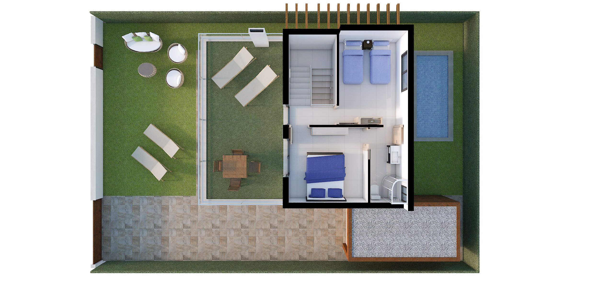 The front of the property has large glass windows that overlook the pool area, and these lead into the lounge/ diner with the American style kitchen to the rear. The white goods are included, and comes with air conditioning. The first bedroom and bathroom are on the ground floor behind the stairs, with the bathroom being accessible from both the open plan living area and the bedroom. The bedroom has views onto the back garden and comes with fitted wardrobes.