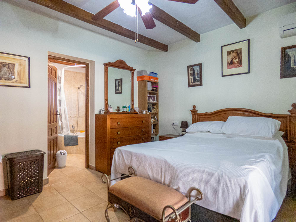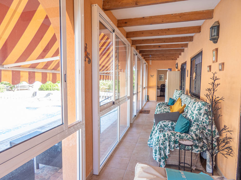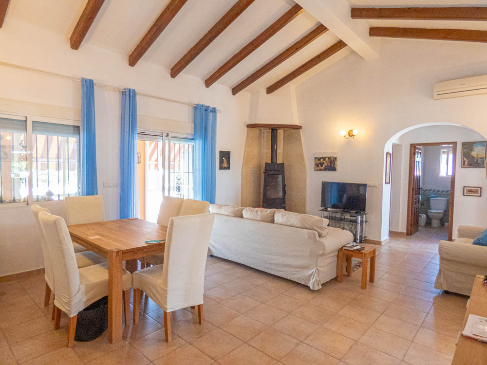 Here is an overview of the villa, as you enter through the electric gates onto the drive the villa sits in front of you, and immediately you feel this is it! You enter the property itself and walk into a large open plan living room, with high ceilings. The current owners have created a lovely dining area to the left of the living area and then a relaxing lounge area around an inviting log burner that is in the far-right corner, it is beautiful. There are glass sliding doors that take you out to a terrace that overlooks the private pool and gardens, to the right of the terrace is a room that the owners use as an office. Moving back inside and to the left of the living area is a good size kitchen that wraps around two walls providing ample space for cooking when you have family or friends round for dinner, there is a door at the far end that provides access out to the garden. The master bedroom is next and is the largest of the three bedrooms and benefits from having its own bathroom. Moving across the living area and to the right of the property, you have two decent size bedrooms and a family bathroom for your guests or family when they are visiting. If you walk out of the main door and walk around the property you have a car port for your car, followed by an outdoor storage area, continuing to walk around the villa to the back you then have a beautiful private pool and a BBQ area for entertaining, all of this sits within a good size plot of approximately 500m2. There are steps on the side of the villa that take you up to the solarium with gorgeous views across the countryside and to the hills in the distance, there is also a large room on this level that could be used as an additional bedroom, office or an artist room, the choice is yours!