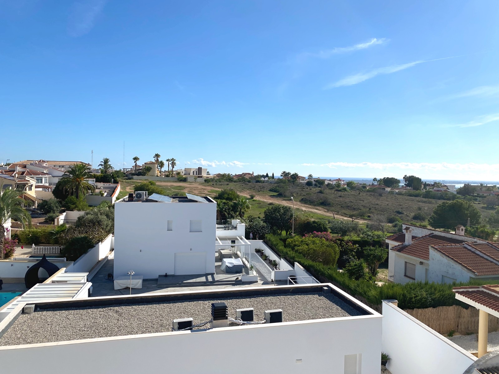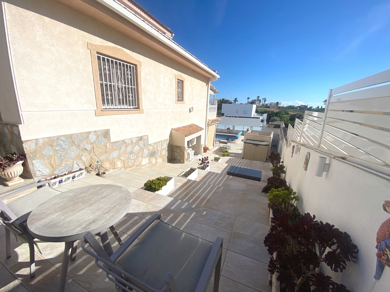Large windows in the lounge flood the living area with natural light giving a bright warm feeling throughout. Patio doors from the dining area open into a lovely glazed, glass curtain terrace currently used as a sunny seating area taking full advantage of its south facing aspect and has stunning views over private pool area, Quesada and to the salt lakes.