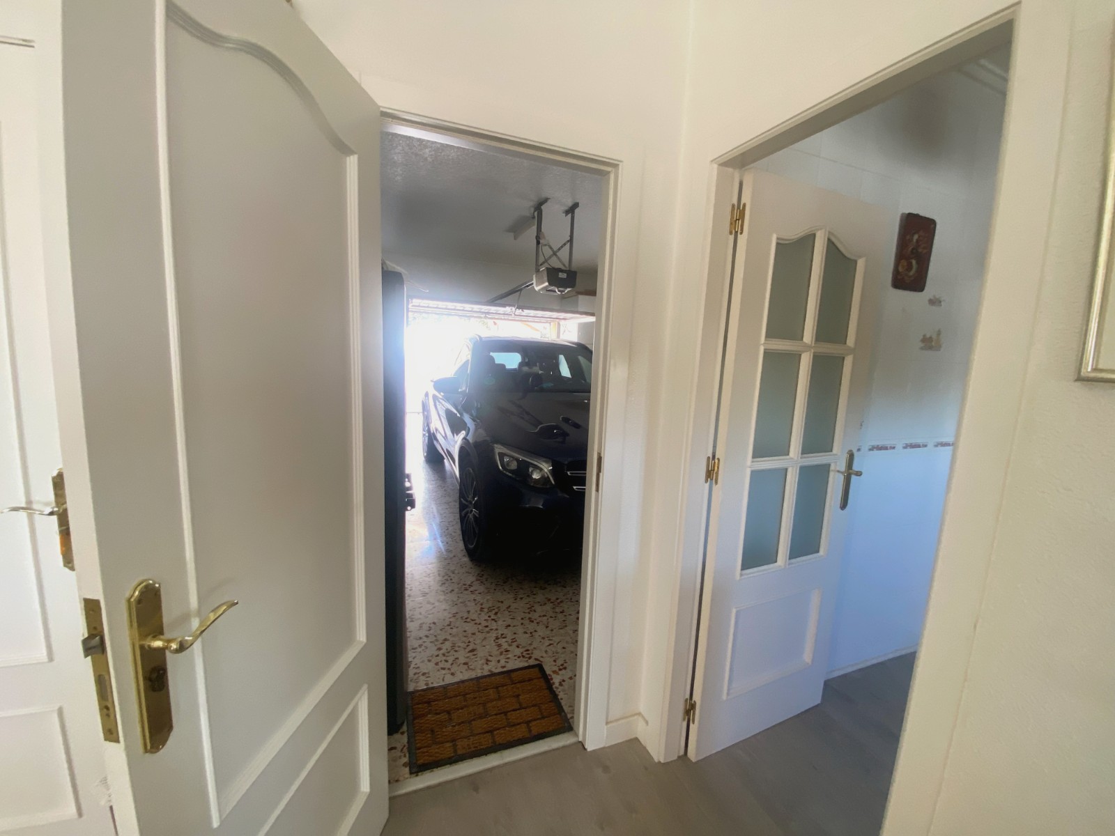 Entrance to the villa, at road level, is the middle floor of this property and the entrance door opens into a large feature entrance hall with a staircase leading to the upper floor and a door that opens into a hallway and a very large living room with a designated dining area.