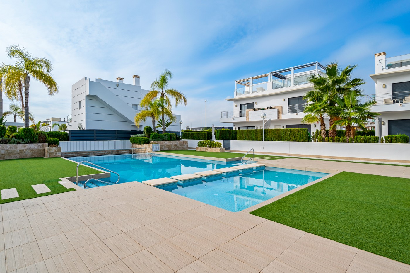 On the ground floor, you’ll find a spacious living room with large French windows that allow plenty of natural light to fill the space. The open-plan kitchen connects to the living area. From the living room, sliding glass doors open onto the terrace located by the entrance. Upstairs, you’ll find three comfortable bedrooms and two bathrooms. Both main bedrooms have their own private terraces with lovely views overlooking the community pool area. External stairs lead up to a spacious rooftop solarium, that includes a shower and a kitchen/BBQ with panoramic views.