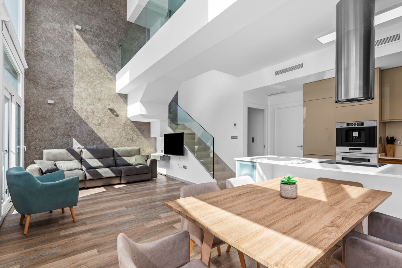 The ground floor includes a living room with an integrated kitchen, a full bathroom, a bedroom, and a laundry area equipped with an 8 kg washer and dryer. The first floor features two additional bedrooms, one with an en-suite bathroom and access to a private terrace. The upper floor has a solarium with space for an outdoor kitchen and a jacuzzi installation.