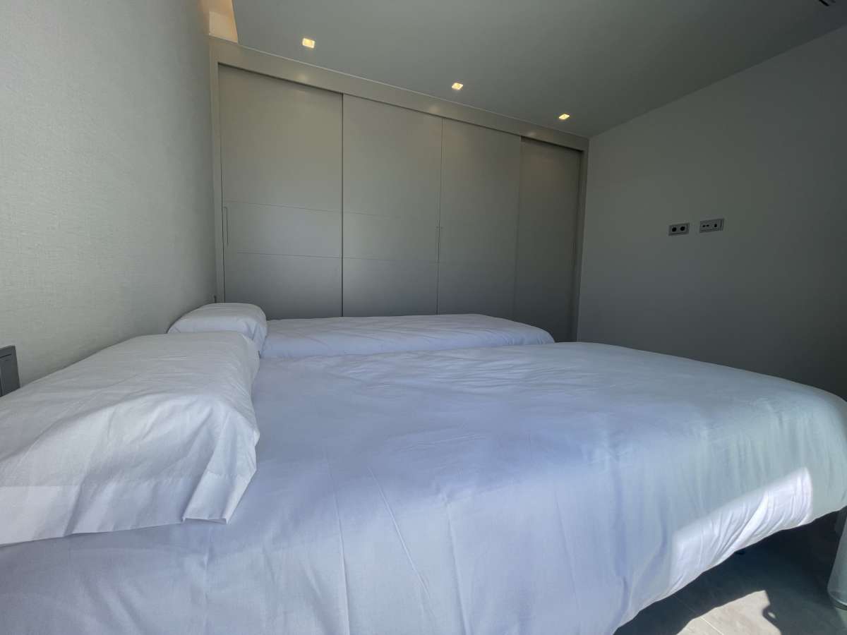 Upon entering the property you immediately enter the living area and spacious open plan kitchen once you have passed the stairs to the first floor and the guest toilet. On the ground floor, there is one bedroom with a spacious bathroom.From the living room and lounge, you have direct access through the large sliding windows to the terrace and the beautiful swimming pool. The terrace is also fitted with a large pergola equipped with an electrically operated slat system which you can set at any angle to block out the sun, if needed. The large infinity pool is built in an L-shape with an extra shallow platform to properly enjoy the sunny days.On the first floor we find 2 bedrooms and a bathroom. Both bedrooms have access on the terraces.