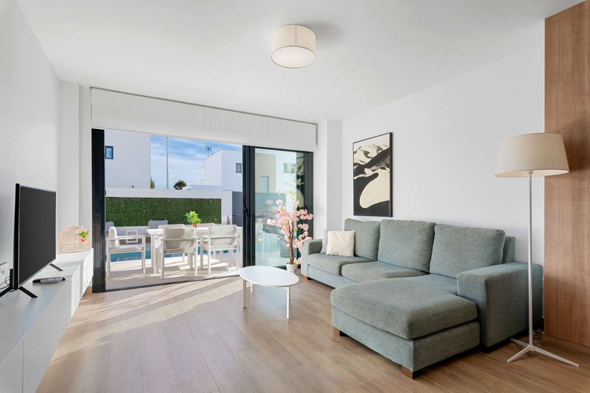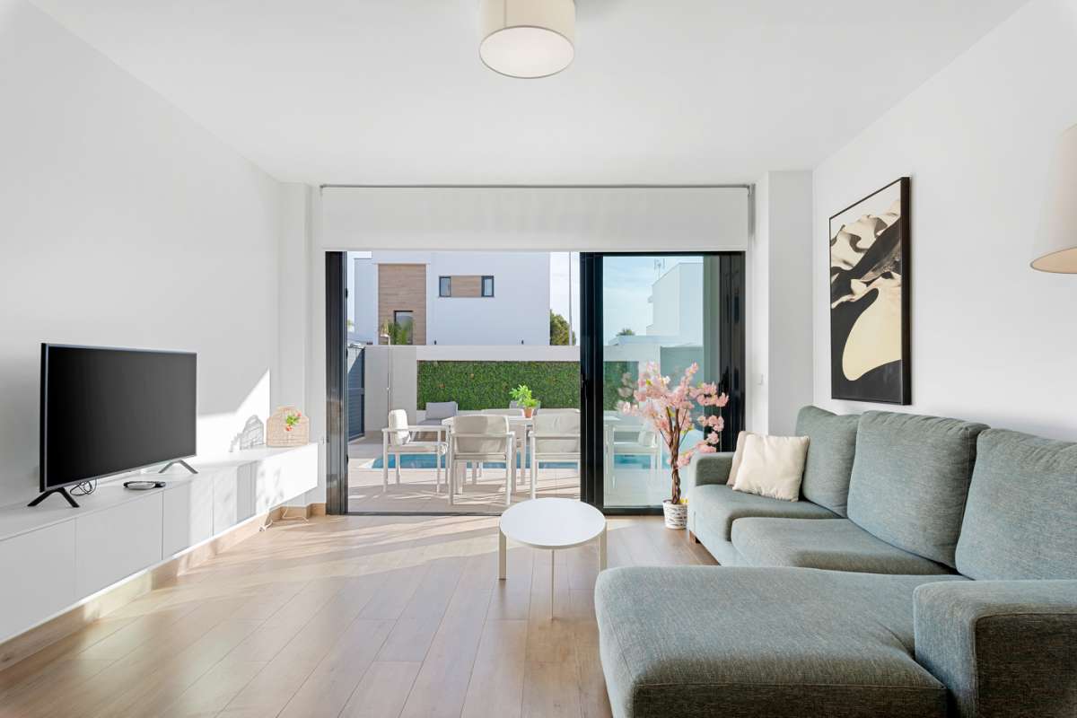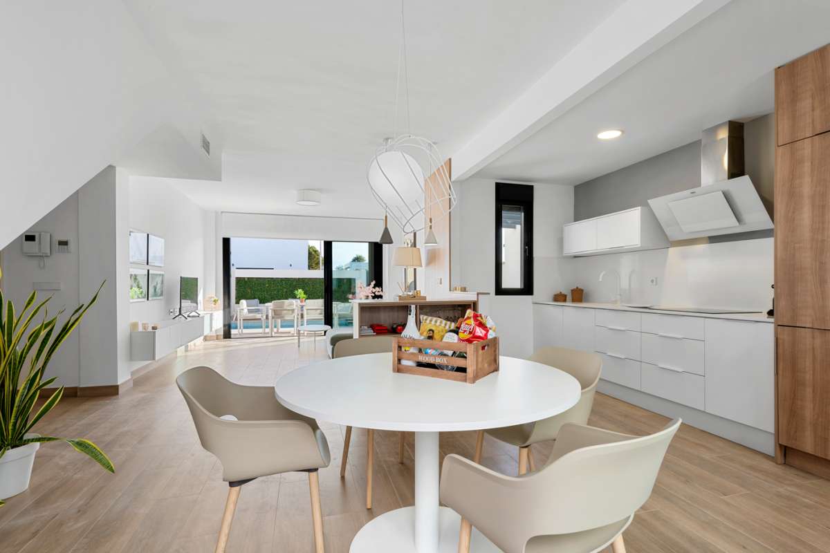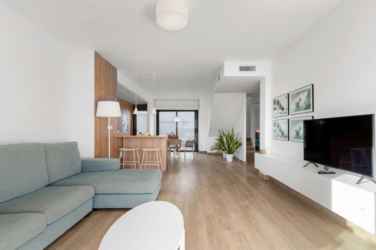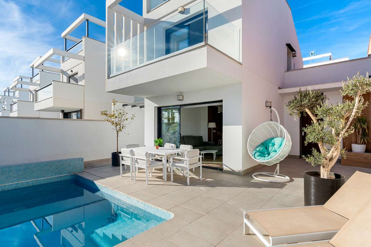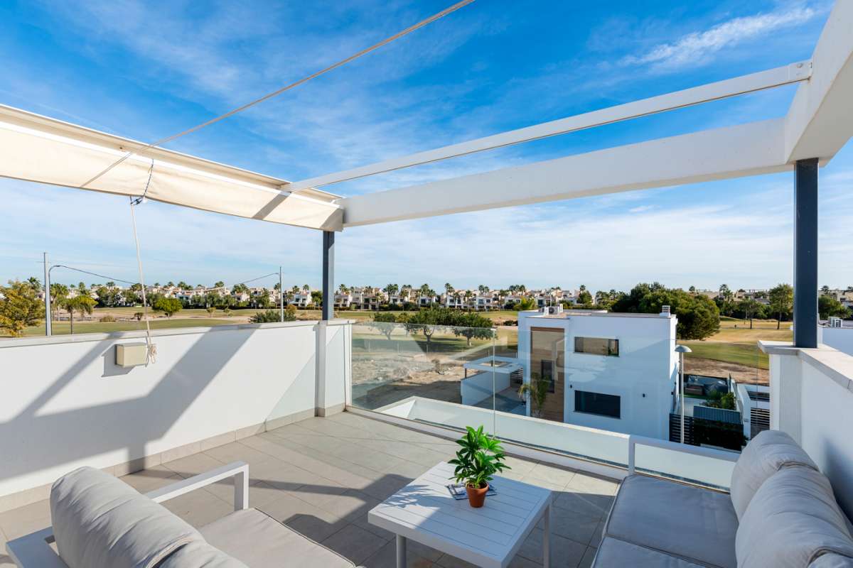 Discover the ultimate in Mediterranean living in our beautiful villa in Roda Golf! Located on the 2nd line of the well-known Roda Golf, you will find this 3-bedroom, 3-bathroom villa with spacious, light-filled living space. Through the spacious terrace with private pool, you enter the plot of this semi-detached villa. Upon entering, you immediately notice the beautiful open space. Thanks to windows at both the front and rear of the house, this property is very light-filled. On the ground floor, in addition to the spacious living room and open kitchen, we also find a bedroom and a guest bathroom. Through the kitchen, the rear terrace can be reached, where there is also a garden shed. At the front of the house you will find the driveway with room for 2 cars, the spacious terrace and, of course, a private pool. This villa is being sold fully furnished.Upstairs, there are another 2 bedrooms and 2 bathrooms. From the master bedroom there is of course an en-suite bathroom, as well as access to a terrace with golf views. To the side of the house, we find another spacious terrace on the first floor, from where there is access to the solarium on the top floor. From here you have breathtaking views of the golf course, the Mar Menor and even the mountains.All this just 3.5 km from the beach. Embrace the perfect blend of relaxation and stylish living. Welcome home to Roda Golf!Year of construction: 2021Common costs: €221.91 per quarter