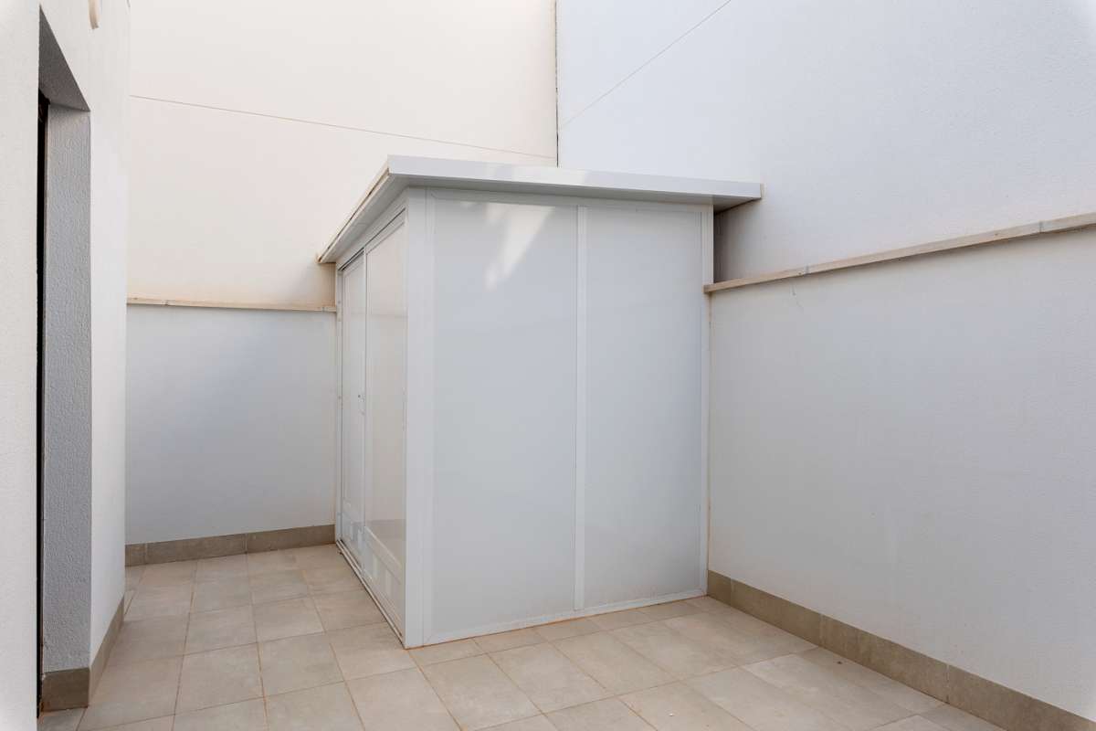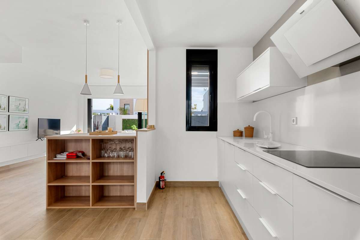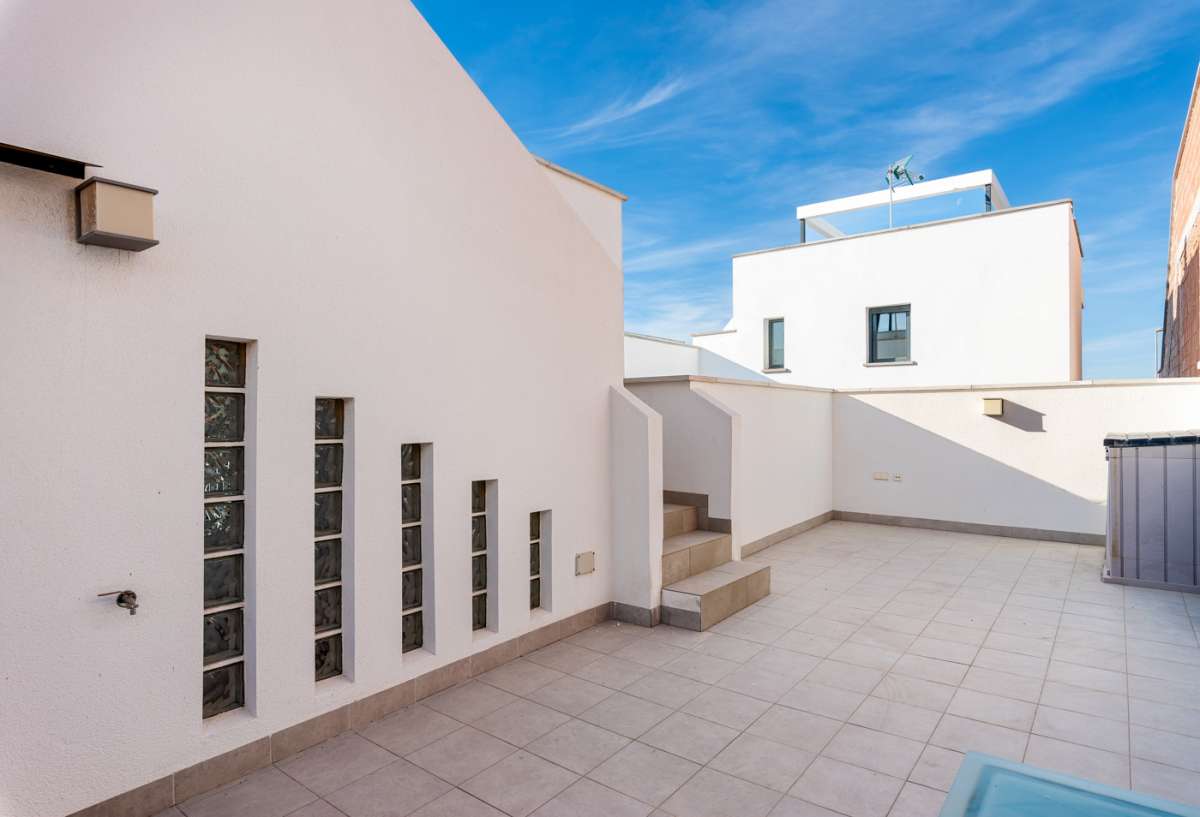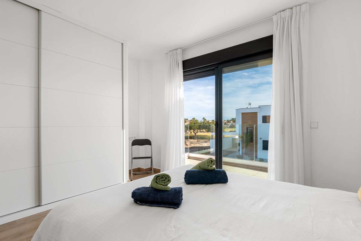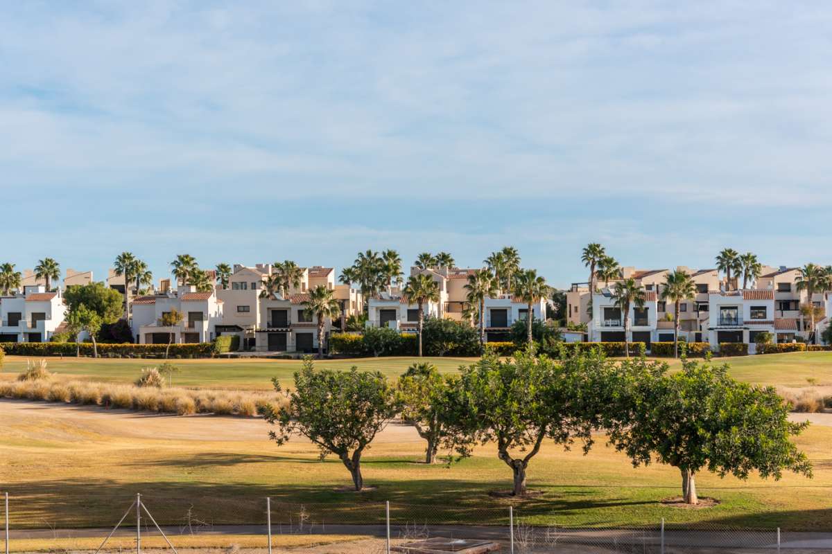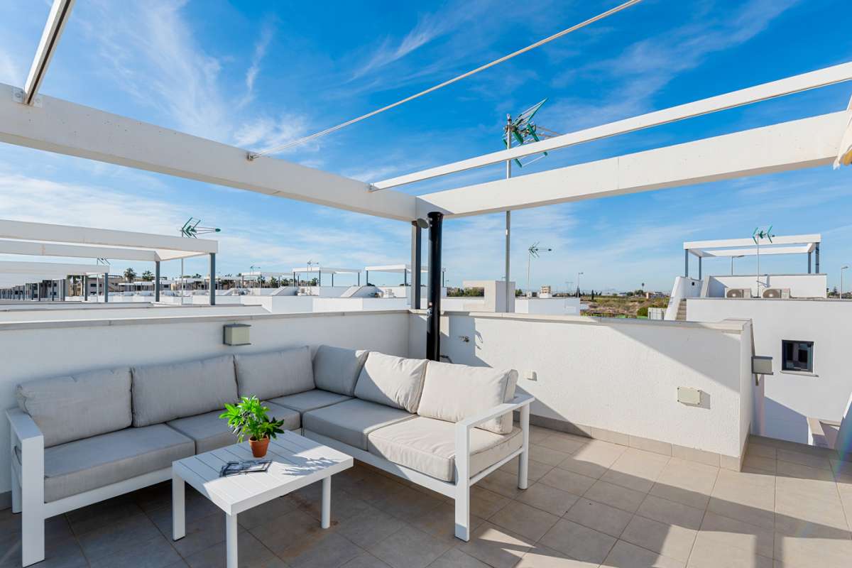 Discover the ultimate in Mediterranean living in our beautiful villa in Roda Golf! Located on the 2nd line of the well-known Roda Golf, you will find this 3-bedroom, 3-bathroom villa with spacious, light-filled living space. Through the spacious terrace with private pool, you enter the plot of this semi-detached villa. Upon entering, you immediately notice the beautiful open space. Thanks to windows at both the front and rear of the house, this property is very light-filled. On the ground floor, in addition to the spacious living room and open kitchen, we also find a bedroom and a guest bathroom. Through the kitchen, the rear terrace can be reached, where there is also a garden shed. At the front of the house you will find the driveway with room for 2 cars, the spacious terrace and, of course, a private pool. This villa is being sold fully furnished.Upstairs, there are another 2 bedrooms and 2 bathrooms. From the master bedroom there is of course an en-suite bathroom, as well as access to a terrace with golf views. To the side of the house, we find another spacious terrace on the first floor, from where there is access to the solarium on the top floor. From here you have breathtaking views of the golf course, the Mar Menor and even the mountains.All this just 3.5 km from the beach. Embrace the perfect blend of relaxation and stylish living. Welcome home to Roda Golf!Year of construction: 2021Common costs: €221.91 per quarter