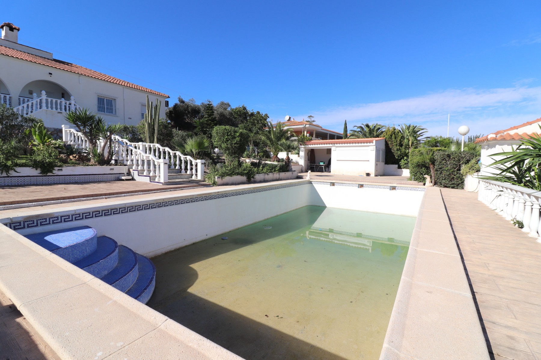 This Spacious, Four Bedroom, Detached Villa in Lomas de la Juliana is located in a prominent position close to La Finca 5* Hotel, Spa and Golf Resort, with bars and restaurants nearby, and Algorfa village just a couple of minutes’ drive away. Towns of Almoradí and Benijofar, with major amenities, are within 5–10 minutes, while the beautiful beaches of the Costa Blanca South can be reached in 15–20 minutes. Set on an impressive 1,355m2 plot, this 215m2 single-level villa is beautifully presented and offers a generous open plan lovely presented living space. The hallway leads through a square arch into the lounge, featuring a feature wall with an inset log burner and two sets of double sliding glazed doors with electric blinds opening onto a covered terrace. There is a dining area, a separate fully fitted kitchen with door to the rear garden, and a utility room. The villa comprises four double bedrooms, all with built-in wardrobes, including a master with en suite shower room, plus a family bathroom. Vast views across the surrounding countryside can be enjoyed from the best part of the home. The landscaped plot includes an outside shower, private 12 x 6 swimming pool (in need of attention), plenty of off road parking, a carport, and a garage for two cars. Additional features include air con units in three rooms, an irrigation system, an outside kitchen, and a store room. This exceptional villa offers spacious, comfortable living with excellent outdoor areas, ideal for enjoying the Mediterranean lifestyle in the sought-after Lomas de la Juliana area of the Costa Blanca South.