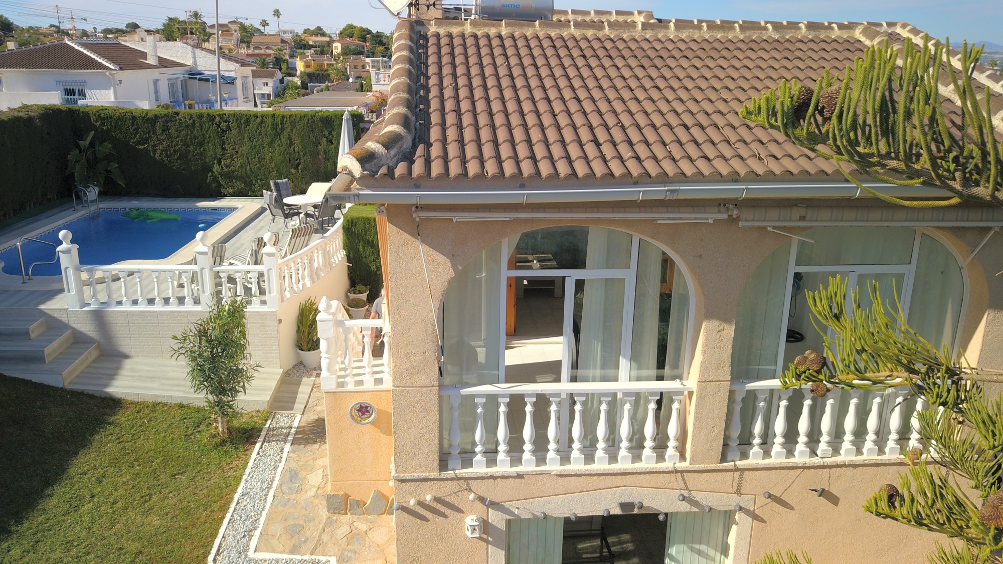 This Four Bedroom South Facing Semi Detached Villa in Los Balcones, is located in a highly desirable area on the Costa Blanca South, within just a 5–10 minute walk from supermarkets and a variety of bars and restaurants. Set on a generous 500m² plot with a 176m² build, this spacious villa offers excellent indoor and outdoor living spaces, perfect for families, holidaymakers or those seeking year-round comfort in the sun. The main level features a separate fully fitted kitchen and a separate utility room for added convenience. The lovely lounge area includes two radiators for heating and leads directly into a bright and welcoming conservatory, which offers an ideal dining space with views over the garden. From here, you also have direct access to the outdoor areas. On this floor you’ll find two double bedrooms, both with fitted wardrobes and the master benefiting from air conditioning. A modern family shower room completes the main living level. The property also boasts a fantastic under build, accessible externally, providing superb additional accommodation. Here you’ll find a good-sized lounge area, two further bedrooms, a fully fitted kitchen and a shower room. Radiators are also installed in the under build, ensuring comfort throughout the year. Outside, the garden is a wonderful combination of tiled and grassed areas, offering plenty of space for relaxation and entertaining. The 6×4 private swimming pool is fully tiled around, providing a low-maintenance and attractive sunbathing area. Additional features include a BBQ area, off-road parking and multiple seating areas spread across the generous garden space. This delightful villa offers space, versatility and a fantastic location — an excellent opportunity to enjoy Mediterranean living at its best on the Costa Blanca South.