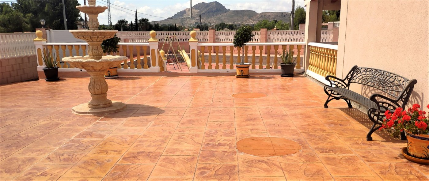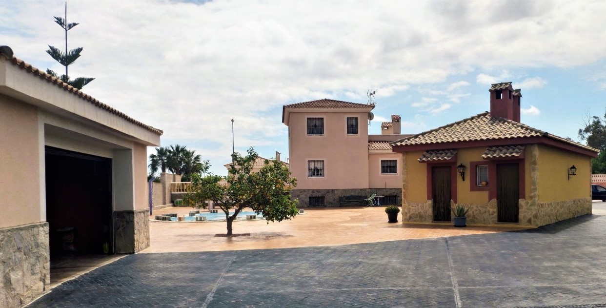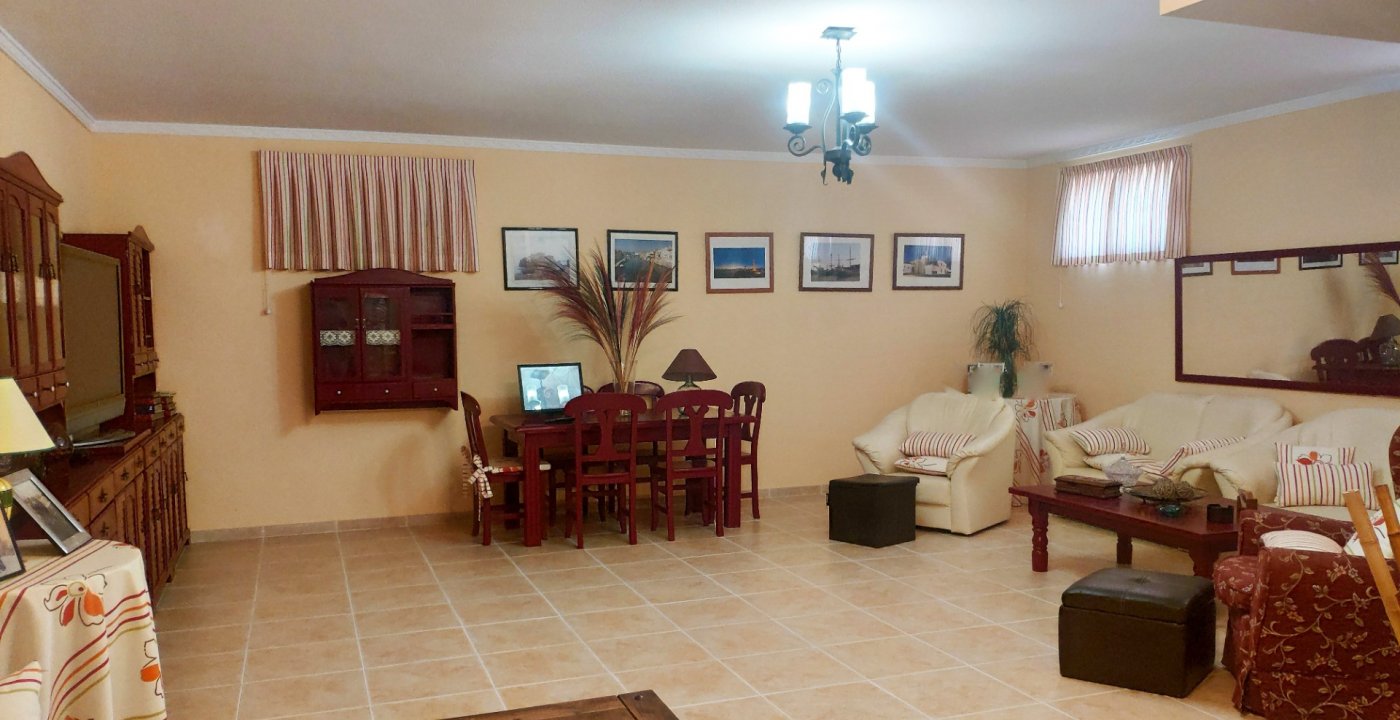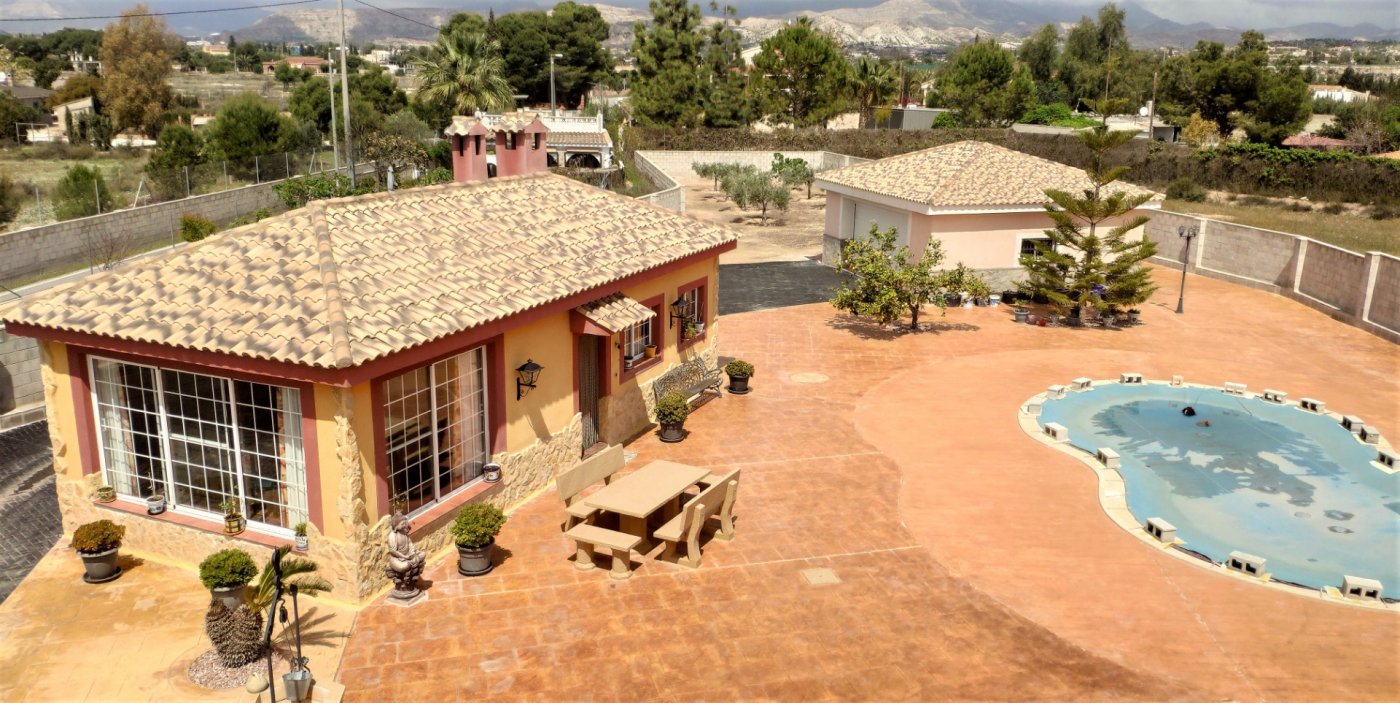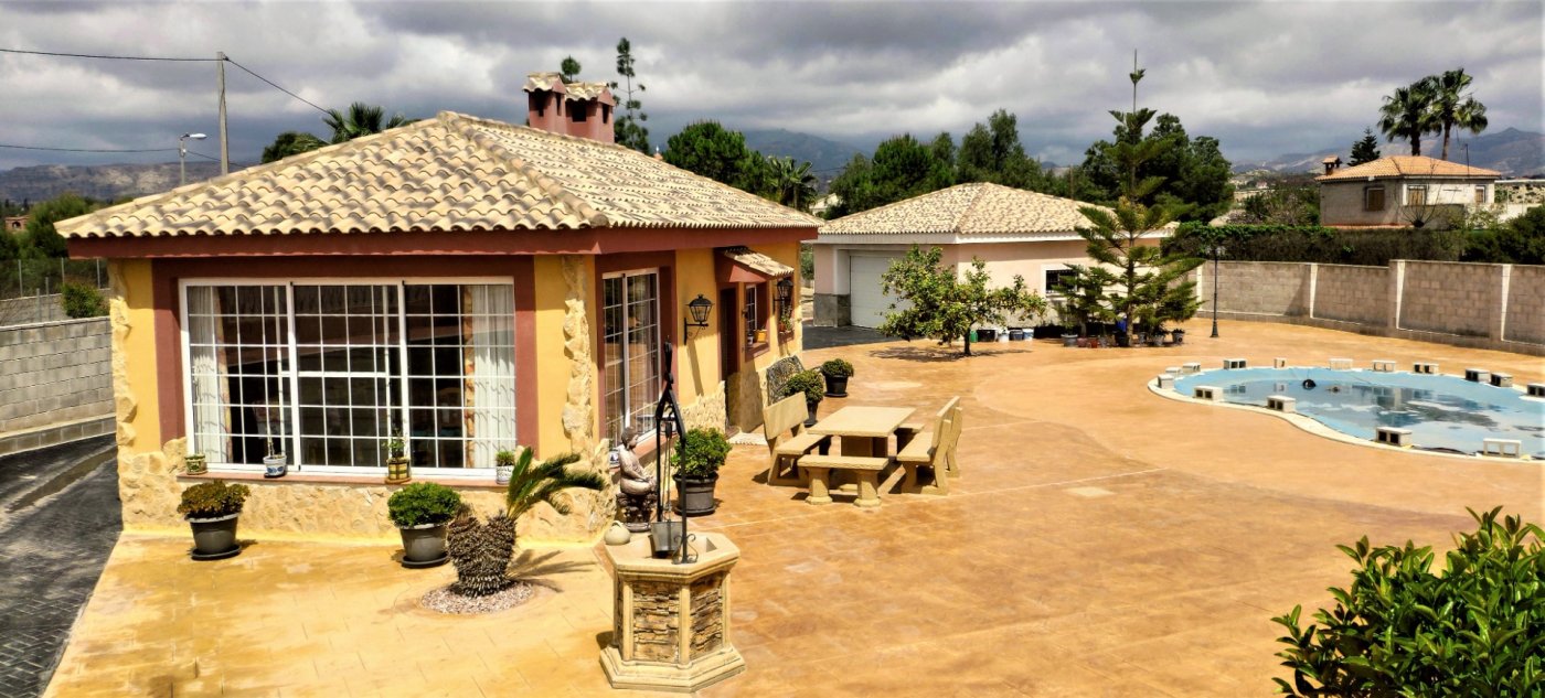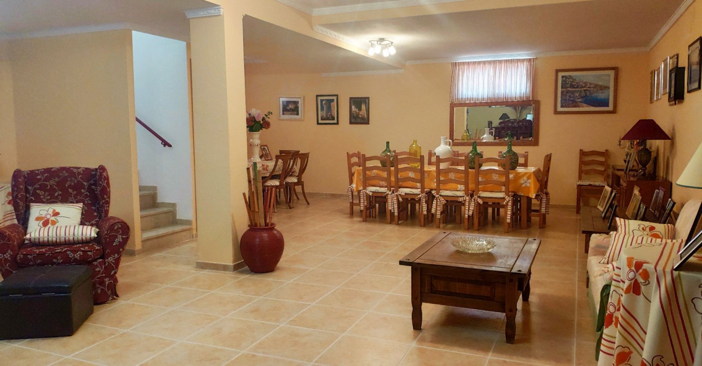 The main house consists of 4 bedrooms, 2 bathrooms and has a living area of 250m2 and a fenced plot of 2297m2. There is a large living room with chimney on the ground floor, a closed kitchen, a 15m2 terrace, a covered terrace, a roof terrace and a balcony. There is also a storage room. There is also a large basement where is a second living room. The house has air condition and central heating.