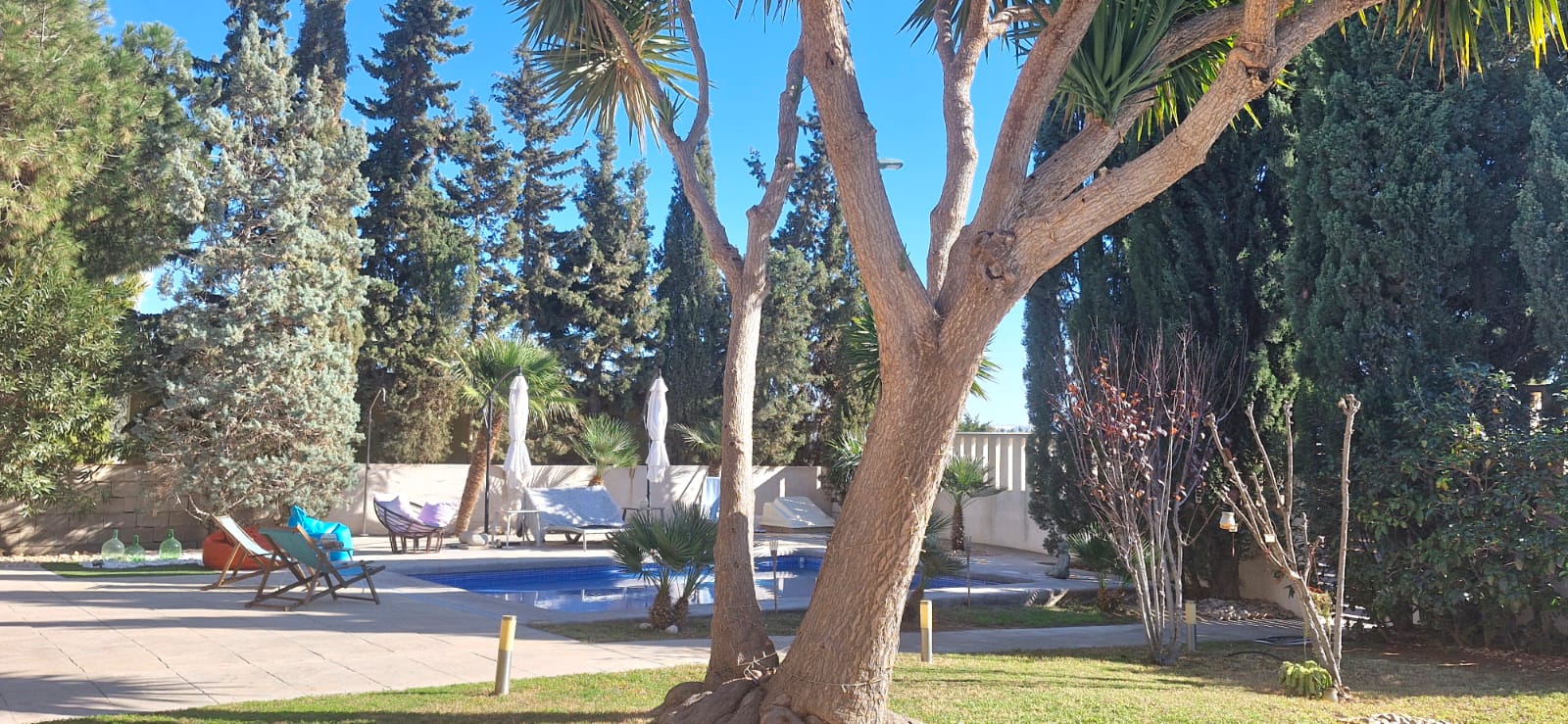 people, parking for three cars, a private pool with garden area, south facing