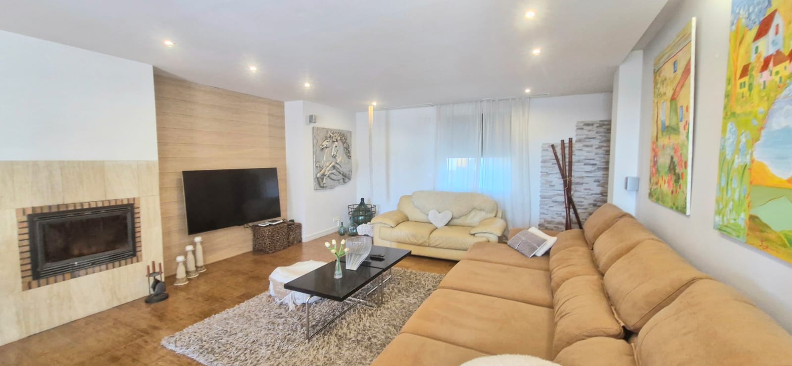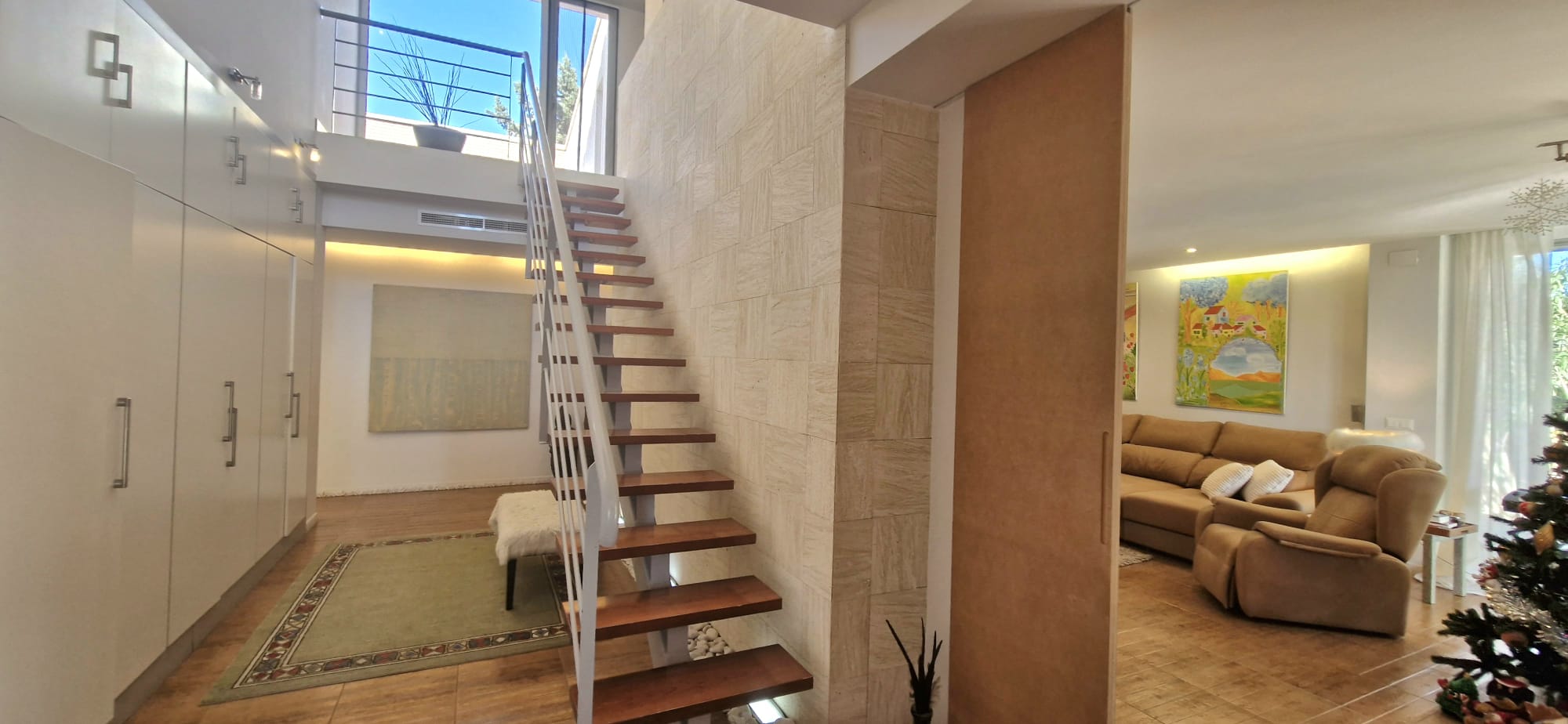 entrance hall, a large living room with chimney and with large windows, a large