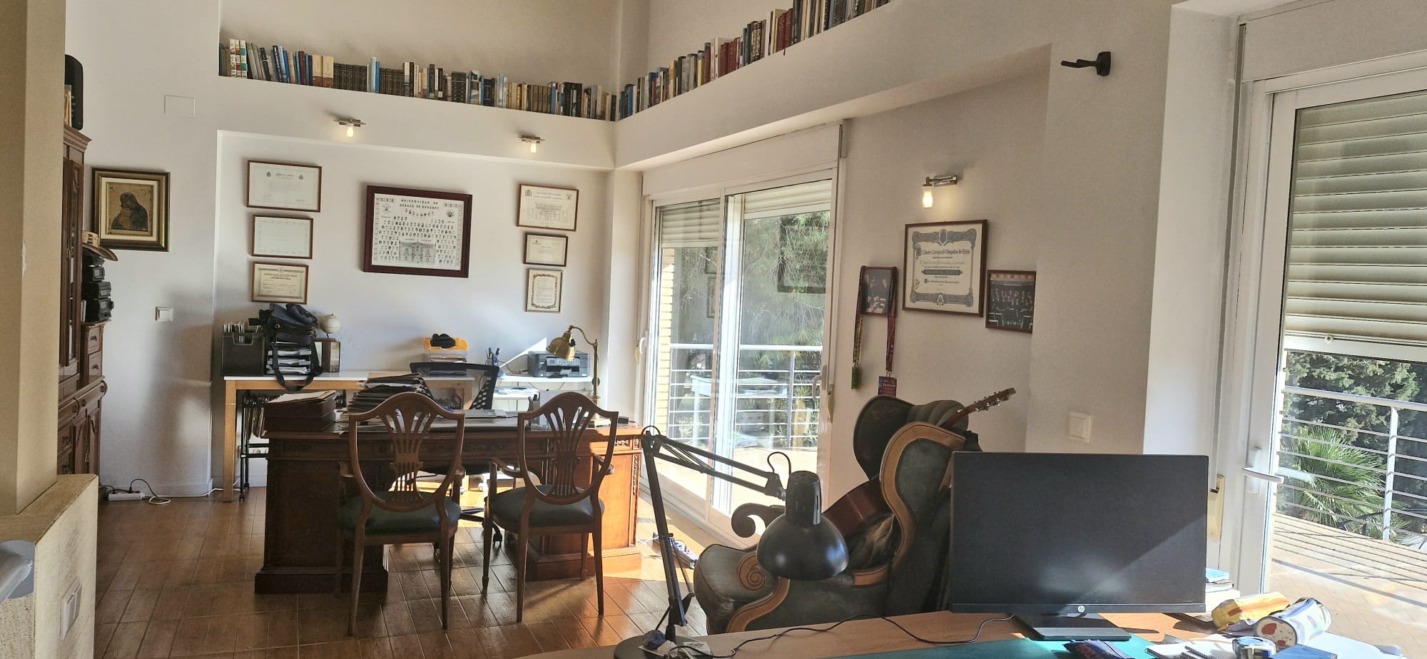 bedroom, a full bathroom, a living area with office, with access to a balcony