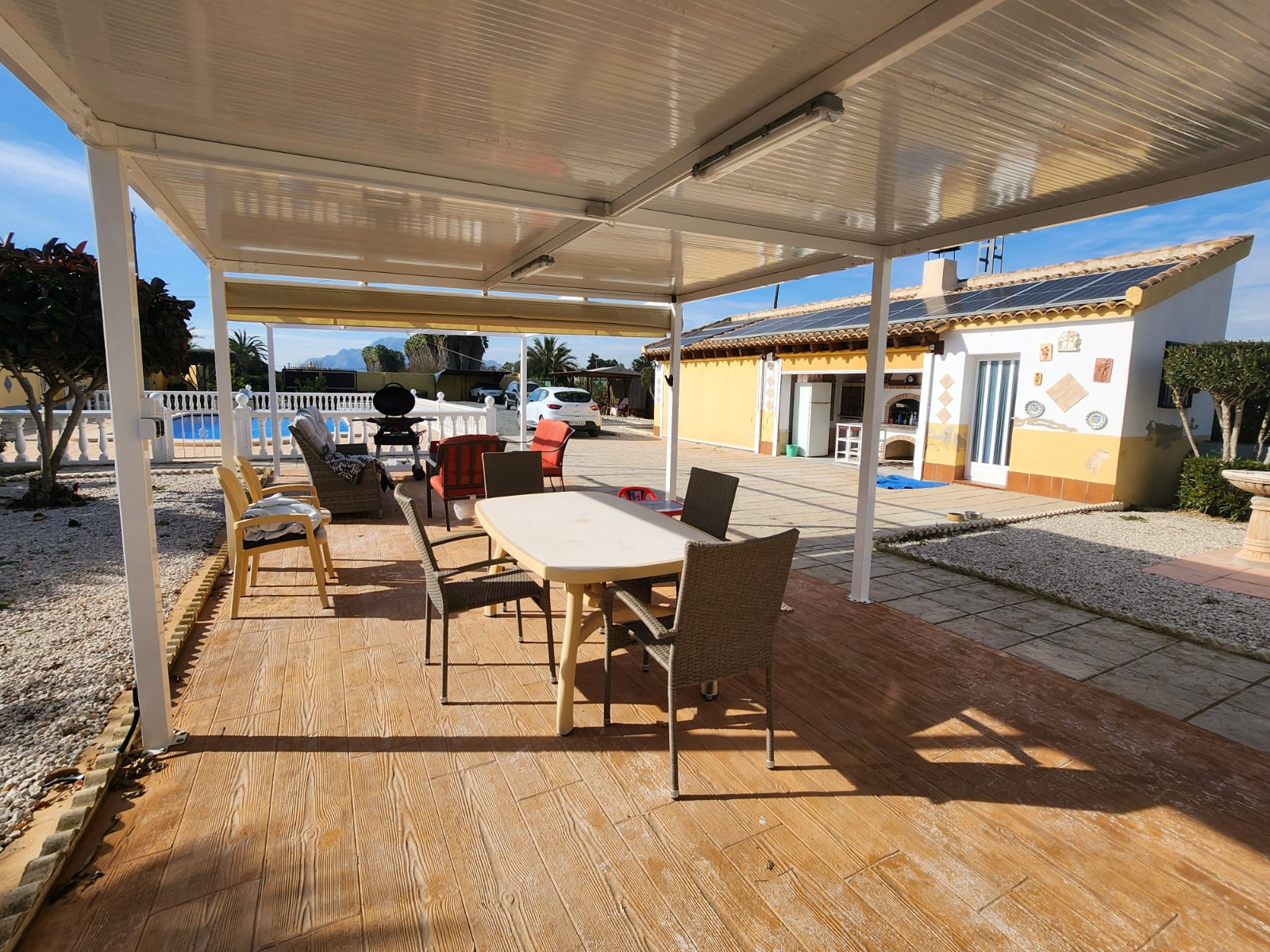 JL Morales Real Estate is excited to present this spacious family home in the tranquil countryside of Catral. Situated on a fully tarmac road with no passing traffic, this property offers both peace and convenience.The 150 m² living space is thoughtfully distributed. Upon entering through the porch/terrace, you step into the hallway. To the right, you’ll find a generous lounge/dining room with a feature fireplace. Adjacent to this is a glazed section of the terrace, which has been converted into a very functional room, complete with a pellet burner for heating. Continuing down the hallway, the fully fitted kitchen includes a separate utility area. There are four double bedrooms, each with built-in wardrobes, with the master featuring an en-suite and a walk-in wardrobe. A large family bathroom with a separate shower completes the interior.Outside, you’ll enjoy a 10×5 private swimming pool with a spacious sunbathing terrace, which offers shade from a pergola with pull-out toldos. On the opposite side of the pool is a large, purpose-built summer kitchen with an adjoining dining area and a fully fitted bathroom.A carport is located near the entrance, and the rear of the property includes an artificial grass area and a wooden storage shed of 4 x 4 metres with electricity. The 2000 m² plot has been laid with gravel for easy maintenance and features a variety of palm trees, fruit trees, and shrubs.Additional benefits include ducted hot and cold air conditioning, full gas central heating, solar panels, electric entrance gates, and an approved wastewater system.Located just a short drive from Catral town, where you’ll find all necessary amenities such as shops, bars, and restaurants, and only 30 minutes from Alicante International Airport. This property offers a perfect blend of rural living with easy access to modern conveniences.