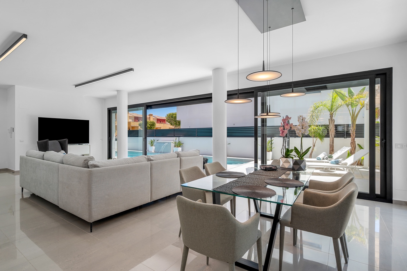 Situated on a 347m² plot, this contemporary villa—built in 2019—offers a refined blend of modern architecture and comfortable living. Spanning 194m² across three levels, the home features four generously sized bedrooms and three bathrooms, with a layout designed for both privacy and functionality. The open-plan kitchen flows into the dining and living areas, creating a bright, spacious environment with direct access to the garden and terrace through large sliding glass doors, inviting natural light throughout the day.