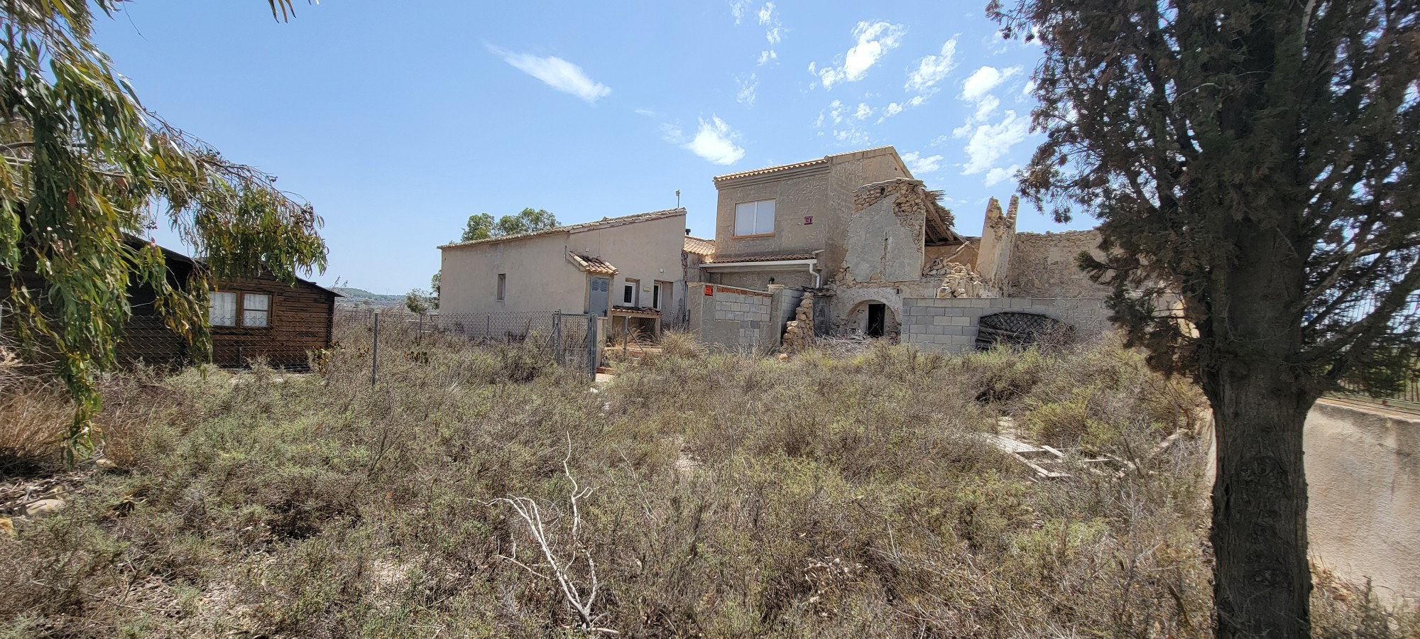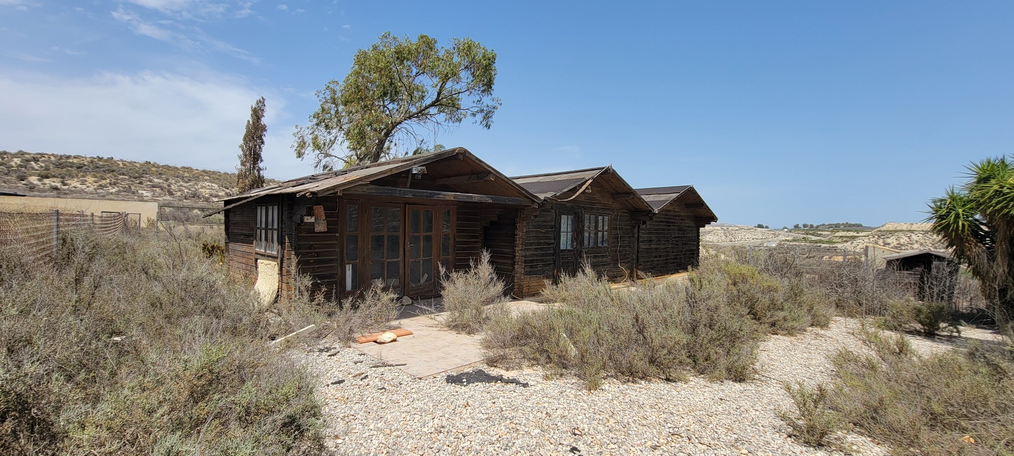 Gated off at the front you have the wooden chalet to your left being 111m2 and the finca 113m2 to your right. Both properties would need TLC. They have not been lived in for several years and are showing visible signs of wear and tear which will need to be pinned.