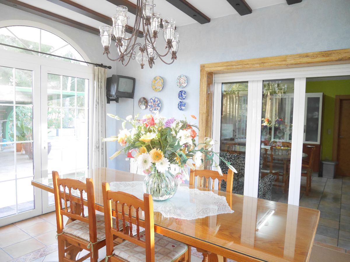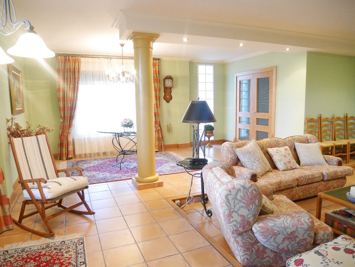 The house consists of 4 bedrooms, 4 bathrooms, a large living room with chimney, a closed kitchen and has a living area of 263m2 and a fenced plot of 4425m2. In the garden is a private pool, a carport for 3 cars and a very large garden area with lawn, palm trees and other shady trees. The garden is very well maintained and is supplied with an automatic irrigation system. An outbuilding has a summer kitchen with barbecue and dining area. This building can easily be converted into a guest house. The basement has a driveway and can be used as a garage or workshop. Furthermore, this property has air condition, heating and a variety of storage options.