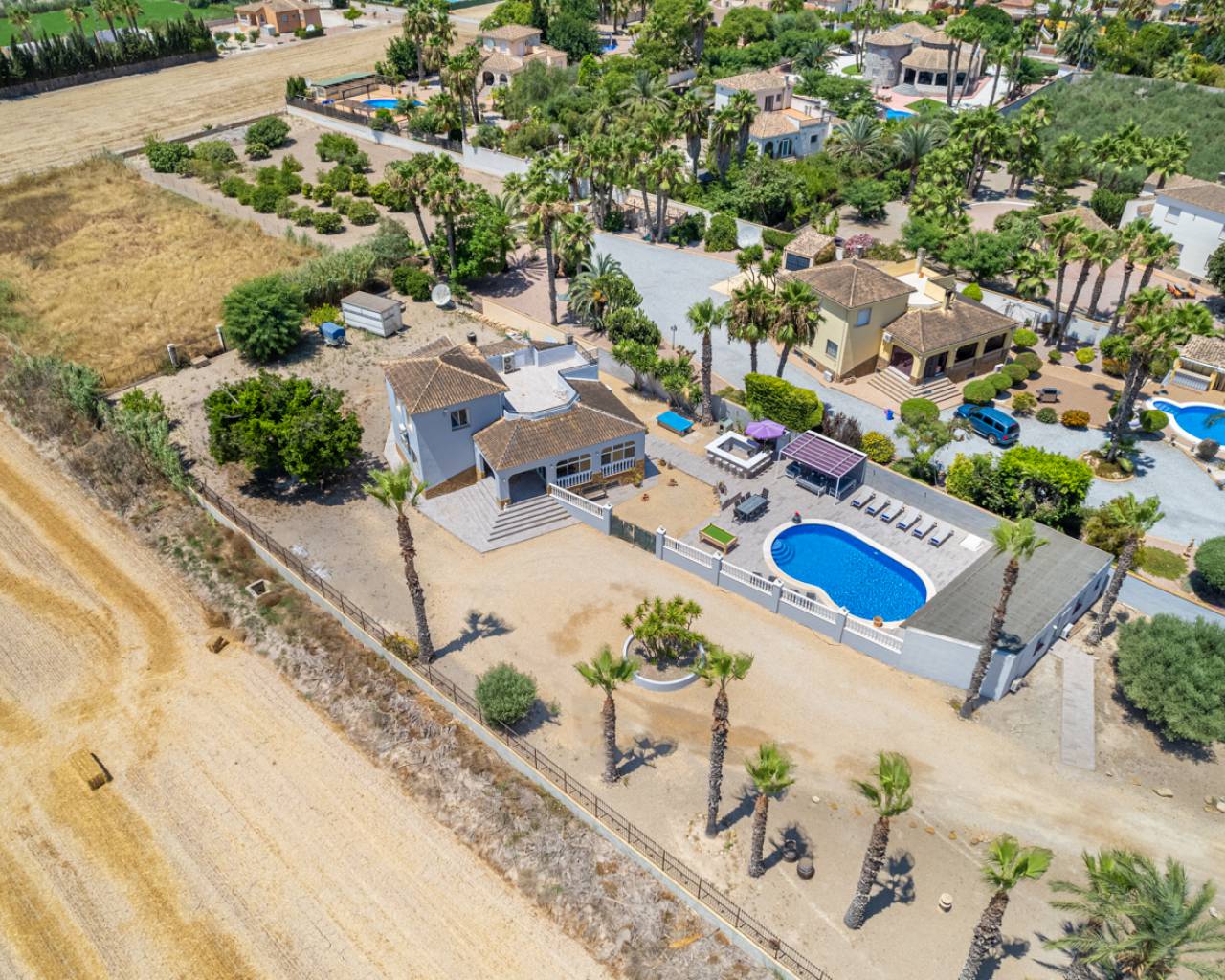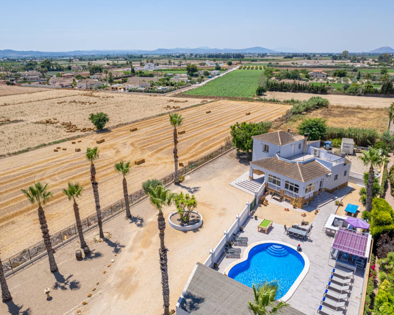 Here we have a stunning 4-bedroom 4-bathroom finca for Sale close to Catral built on a huge 5800m2 plot, which also includes the self-contained apartment with a lounge area, kitchen and an additional bedroom, bathroom and WC. Upon entering this country property there is a long drive leading up to the house where there is plenty of space to park your vehicles.