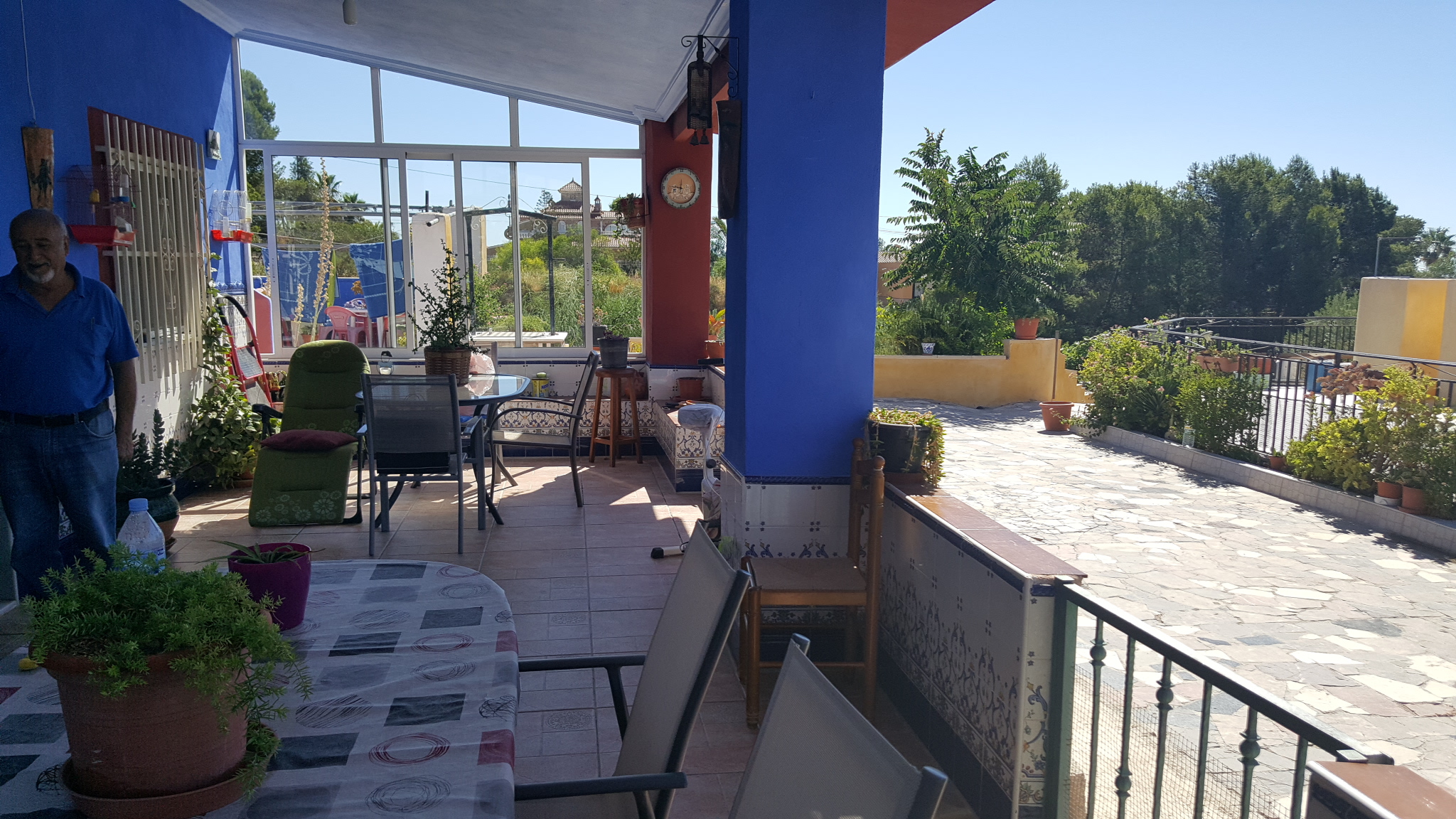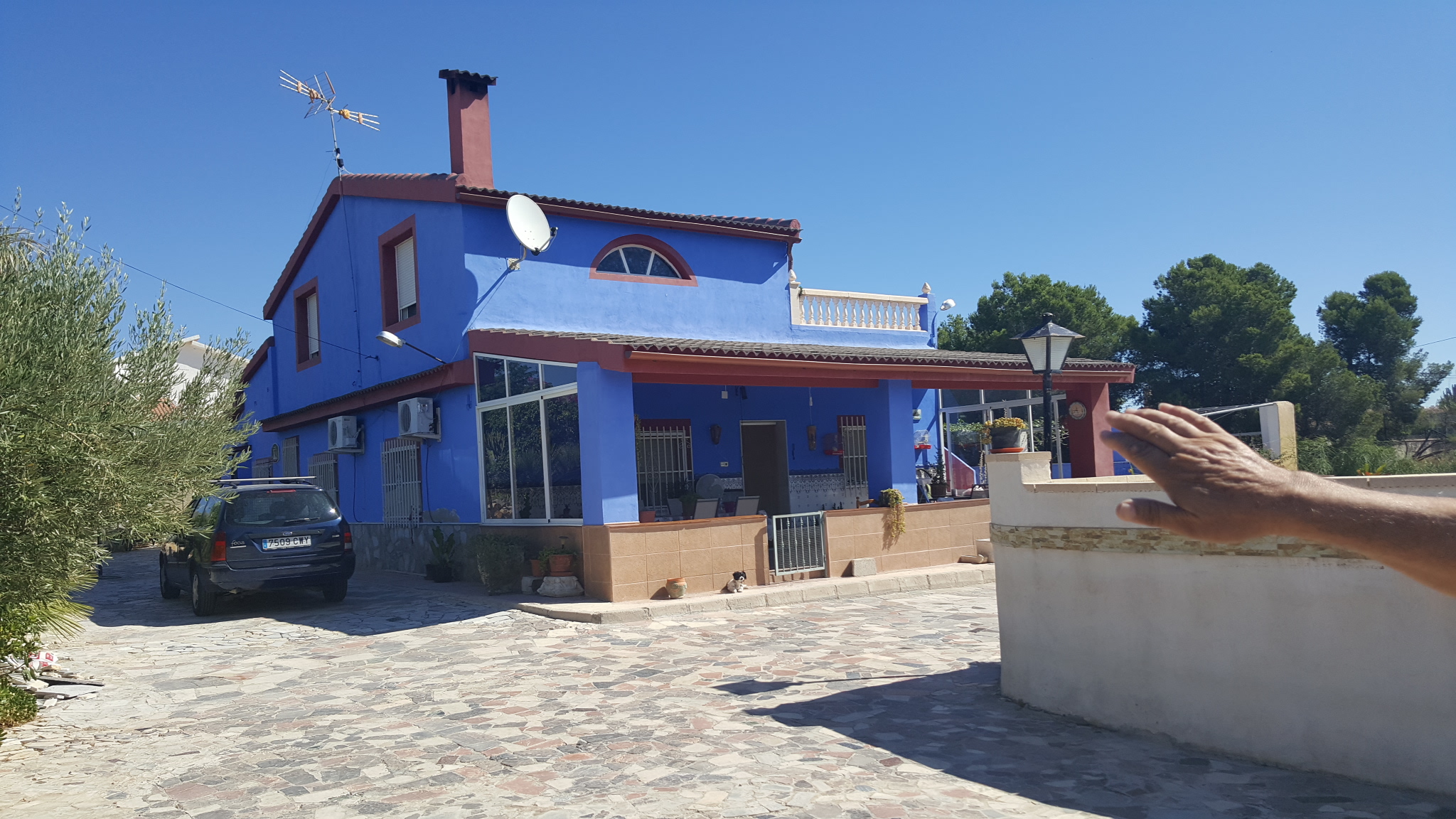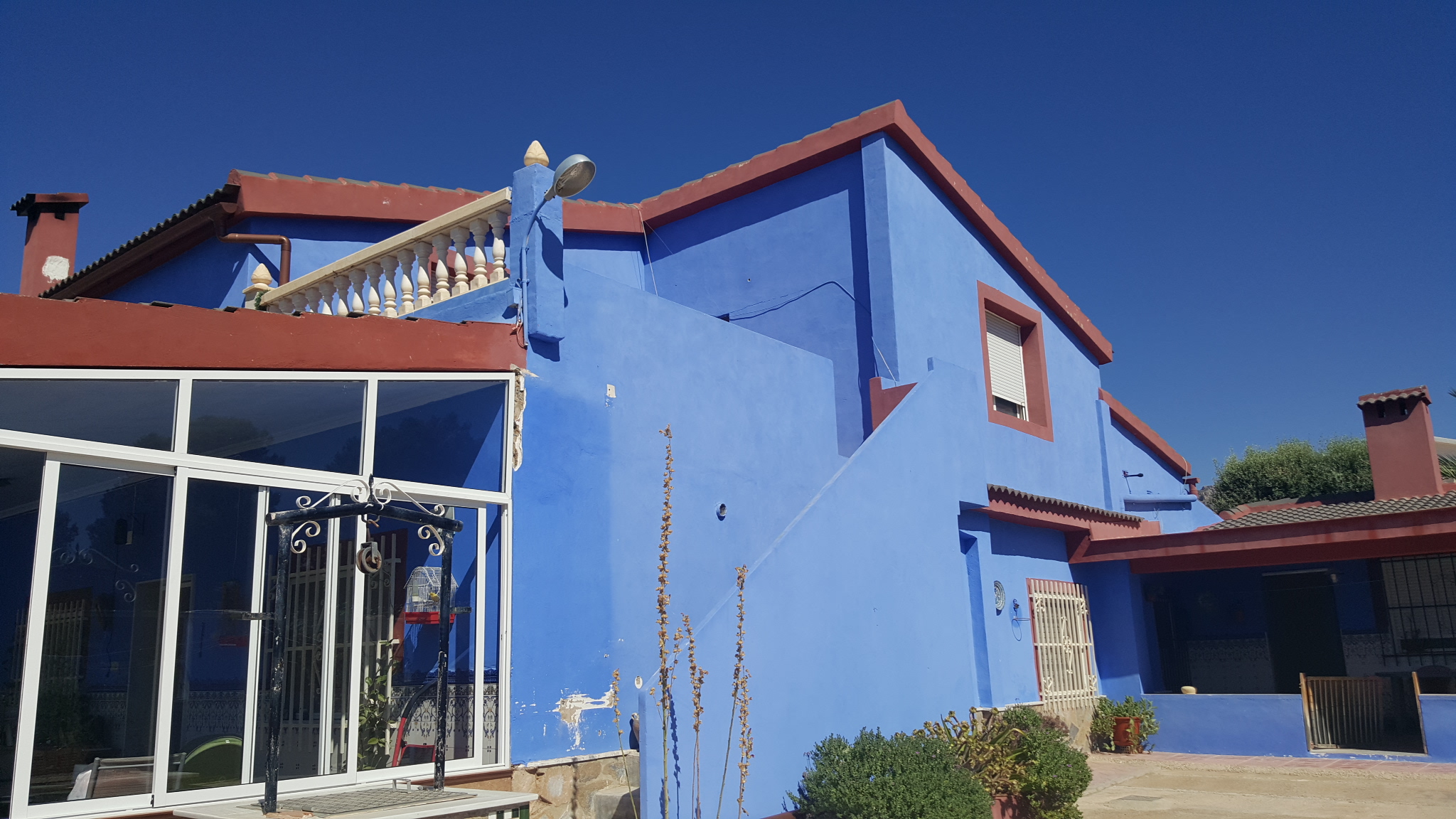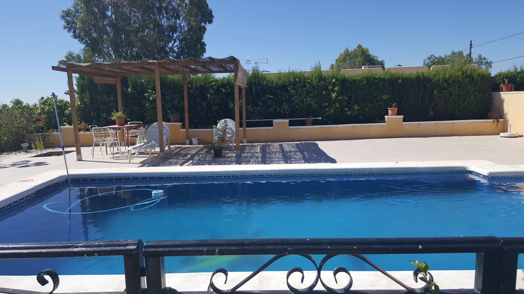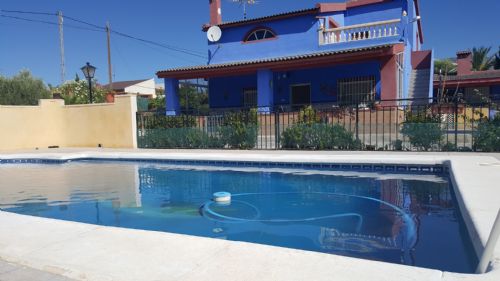 It has a fenced plot of 2.000 m2 and a constructed area of 416m2. The main house has three bedrooms, a bathroom, a living room, a kitchen, a covered terrace and a balcony, there is also a guest house with two bedrooms, a living room, a kitchen and a bathroom. The house has a large room on the second floor where you could build two bedrooms more, living room, kitchen and bathroom. In addition there is also a 50 m2 garage. It has air condition, a barbecue and a private pool.