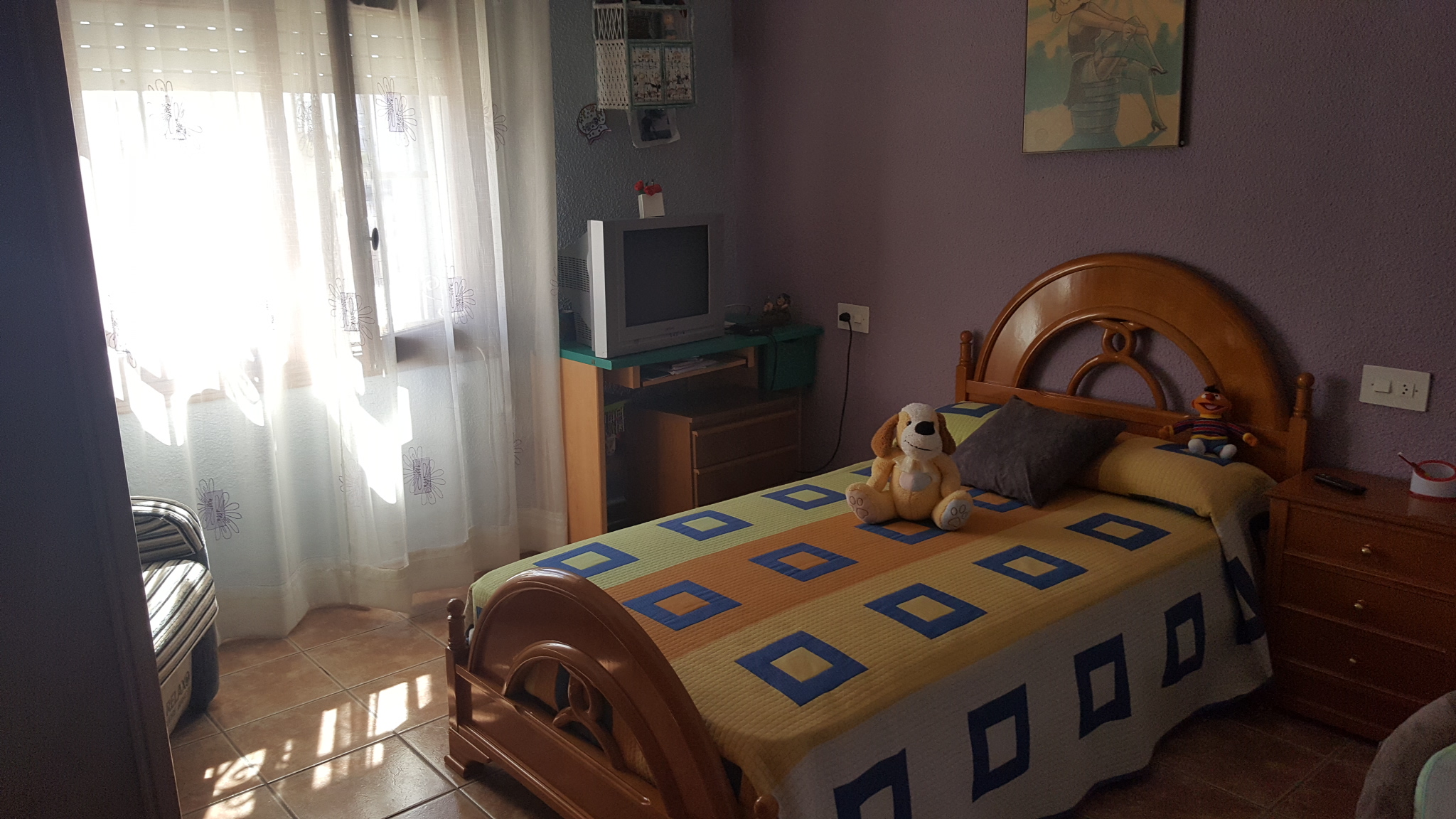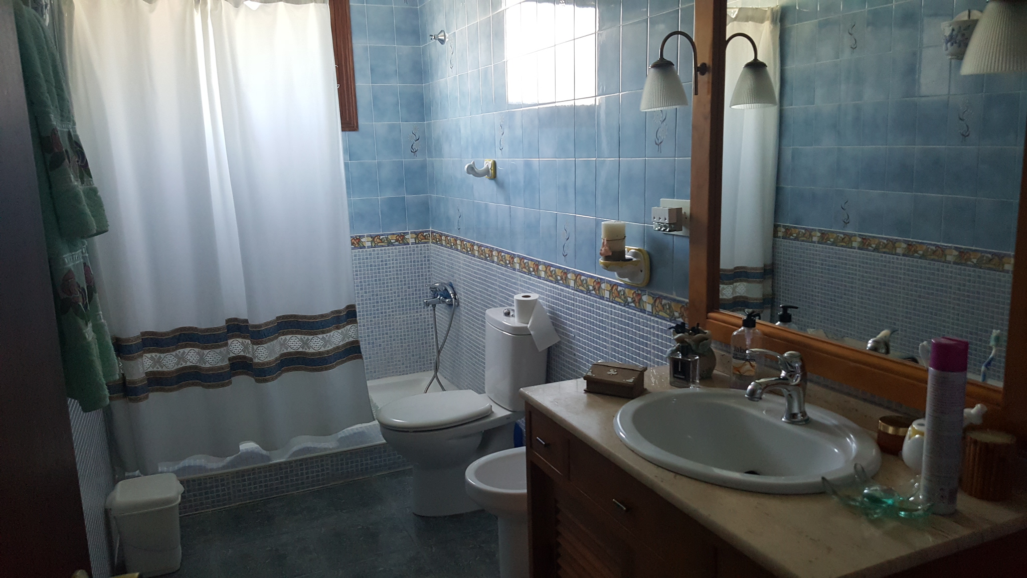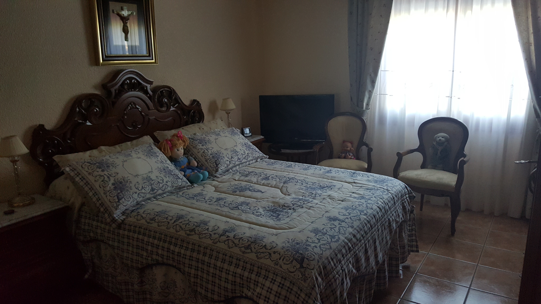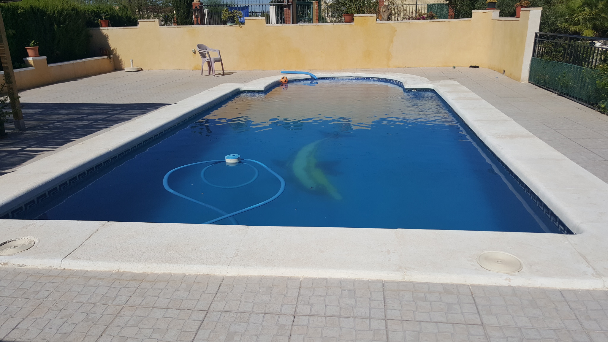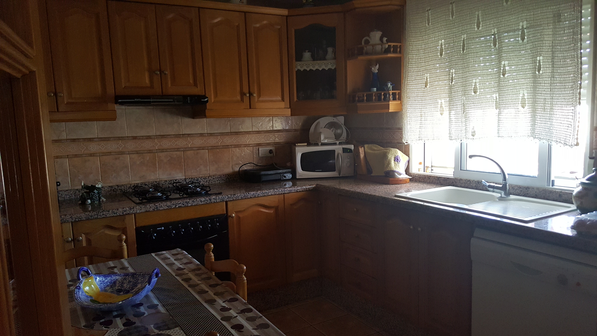 It has a fenced plot of 2.000 m2 and a constructed area of 416m2. The main house has three bedrooms, a bathroom, a living room, a kitchen, a covered terrace and a balcony, there is also a guest house with two bedrooms, a living room, a kitchen and a bathroom. The house has a large room on the second floor where you could build two bedrooms more, living room, kitchen and bathroom. In addition there is also a 50 m2 garage. It has air condition, a barbecue and a private pool.