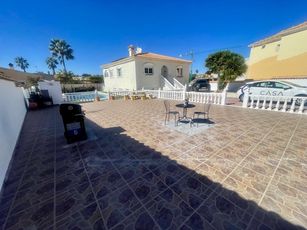 We are delighted to present this fantastic five-bedroom, two-bathroom detached villa with private swimming pool, ideally located in the prestigious La Escuera area of La Marina Urbanisation.Offering 308 m² of built space arranged over two levels and set on a generous 980 m² plot, this property represents the perfect blend of comfort, space and Mediterranean lifestyle. The villa is in very good condition, beautifully maintained, bright and ready to move into.Situated within the sought-after La Escuera residential area, the property enjoys a peaceful setting while remaining close to local amenities and the stunning Blue Flag beaches of La Marina. It is an ideal location for those seeking tranquillity without compromising on convenience or proximity to the coast.The upper level features two spacious and tastefully designed bedrooms, both filled with natural light and offering pleasant open views. The family bathroom on this floor is finished to a high standard and offers a spa-like atmosphere, complete with a large bathtub, separate walk-in shower and double washbasin.The lower level comprises three additional bedrooms, two of which include fitted wardrobes, making them ideal for family members. A second full bathroom provides added convenience, and there is also a useful storage room.The basement benefits from a quality ventilation system specifically designed to prevent damp and odours, ensuring a dry, fresh and comfortable environment throughout the year.The exterior of the property is truly impressive. The large private swimming pool is surrounded by relaxation areas, creating a perfect setting for enjoying the sunshine. A dedicated chill-out space provides the ideal spot to unwind during the day or enjoy warm Mediterranean evenings in complete serenity, there are solar panels in the house producing clean, renewable energy and reducing your long-term energy costs.The expansive 980 m² plot offers endless possibilities, whether you envision landscaped gardens, a children’s play area or additional outdoor leisure spaces.The property holds a licence to build a substantial garage of great size where a Caravane can fits offering an excellent opportunity for those who has a Caravane.Combining generous living space, privacy and an enviable coastal location near the Mediterranean Sea, this villa is perfectly suited as a permanent residence, holiday home or investment opportunity.