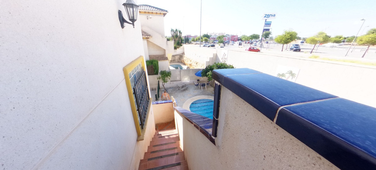 Key Features:Prime Location:  Just a 2-minute walk from La Zenia Boulevard, surrounded by bustling commercial hubs, restaurants, and entertainment options.  Conveniently located between the lively areas of Playa Flamenca and La Zenia, making it the perfect spot for dining, shopping, and enjoying all the attractions of the Orihuela Costa. Upon entering the villa via the external stairs, you're greeted by a spacious south-facing terrace that connects to the living and dining area through patio doors, flooding the space with natural light.  An inviting open-plan layout that provides a bright and spacious environment for relaxation and entertaining.  The kitchen is well-equipped to cater to daily needs.  Two generously sized double bedrooms and a modern bathroom featuring both a bath and shower. Upper Level:   Accessible via external stairs, the upper level boasts a private solarium, ideal for sunbathing, relaxation, or hosting social gatherings.  An additional bedroom and bathroom on this floor provide extra comfort and privacy for guests.