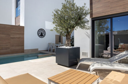 Ciudad Quesada Detached villa model Lucia Especial with a plot of 700 m2 in front of a park with a house on two floors plus basement with an area of 355 m2, with 5 bedrooms and 4 bathrooms, the house is structured in a basement with 145 m2 and has a Turkish bath (Haman), Sauna relaxation area, bathroom, bedroom, cinema area, billiards and table football, the ground floor has 145 m2 and has 2 bedrooms, bathroom, kitchen and large living room with fireplace, the upper floor with 65 m2 has 2 bedrooms, 2 bathrooms, 2 terraces with views of the sea and the lagoons, the house is sold furnished and has a large heated swimming pool, Jacuzzi and barbecue area with outdoor kitchen, also, driveway with pergola.~