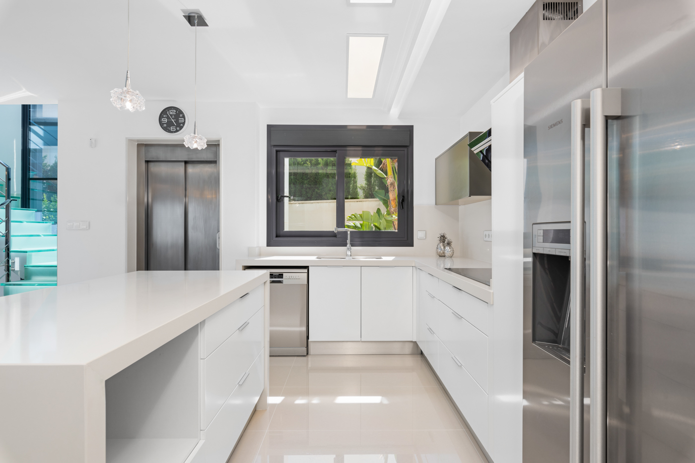 This recently built luxury property has a total of 5 bedrooms and 4 bathrooms, distributed over two floors and a basement, with a practical elevator that communicates with all the floors of the house and a beautiful glass staircase with interior lighting. In the basement we find a game room (with billiards and table football), a room for celebrations with a full kitchen, 2 bedrooms, 2 storage rooms and a full bathroom. On the main floor we find the living-dining room with an open-concept kitchen and central island, the main bedroom with an en-suite bathroom, as well as a laundry room and a toilet. On the first floor there are 2 spacious bedrooms, 2 bathrooms and access to the balconies. On the top floor we find an incredible 70m2 solarium with impressive panoramic views.