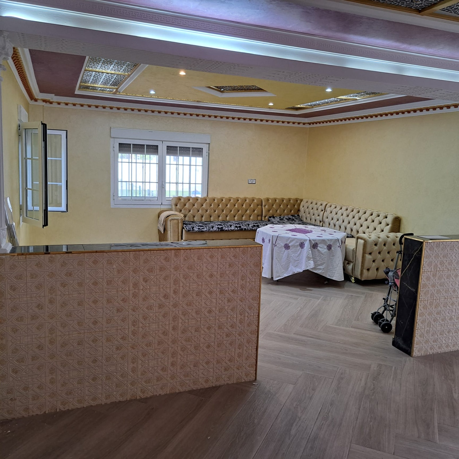 bathrooms, a large living room with open kitchen, an extra living room, a small