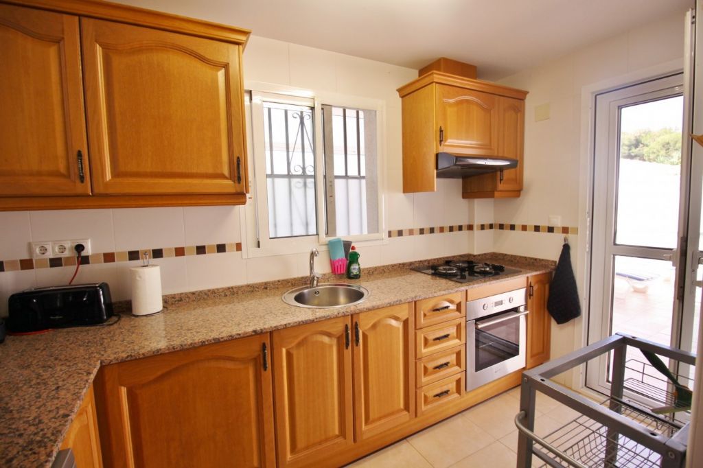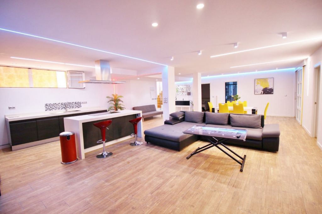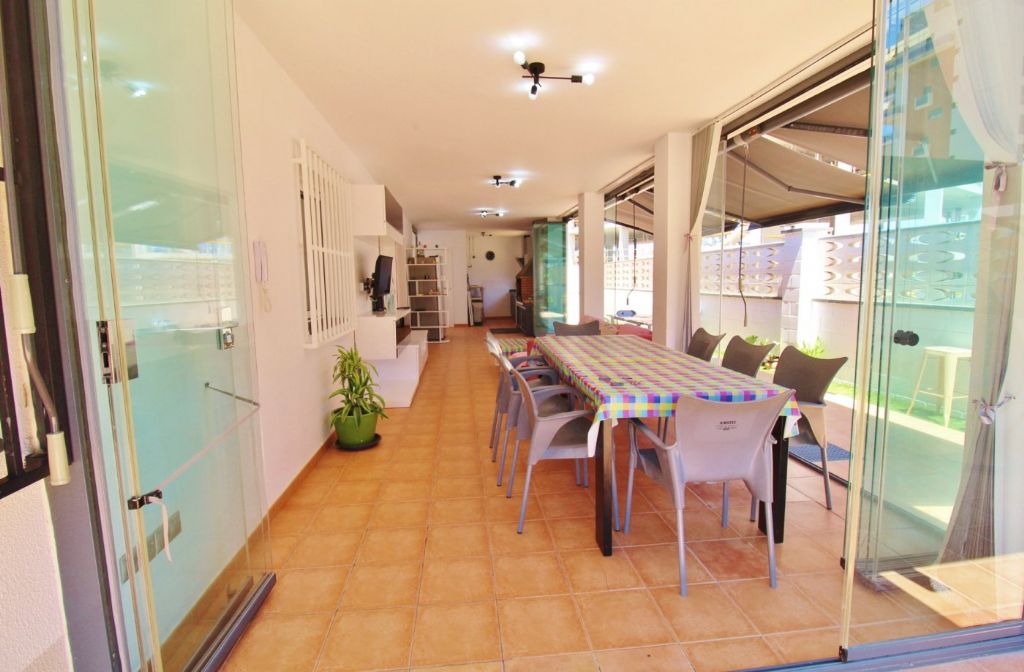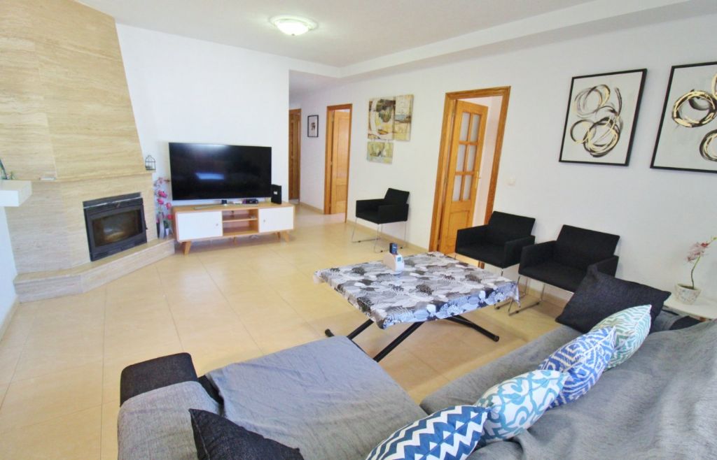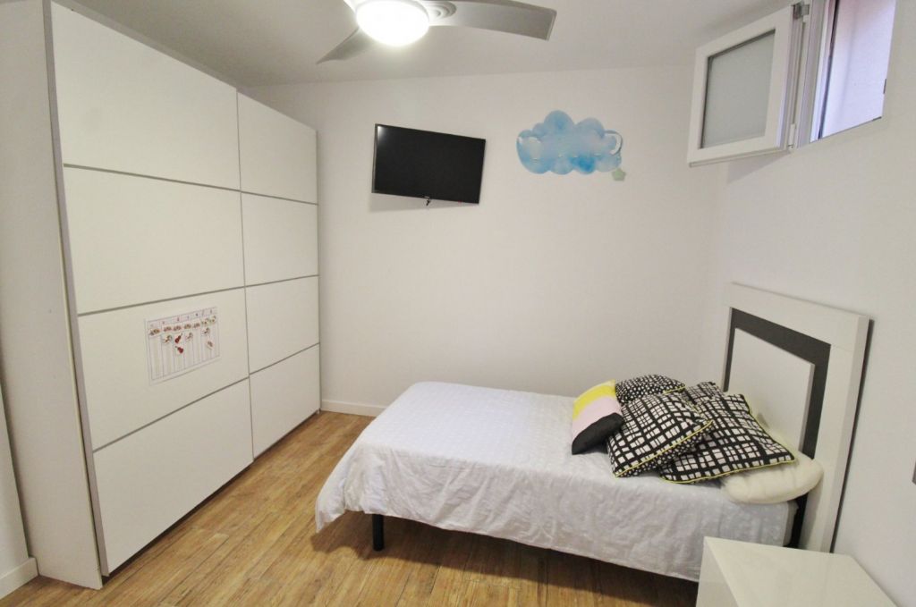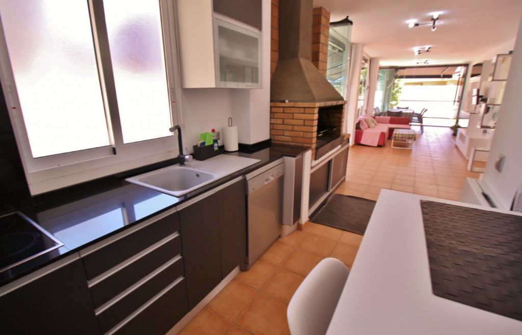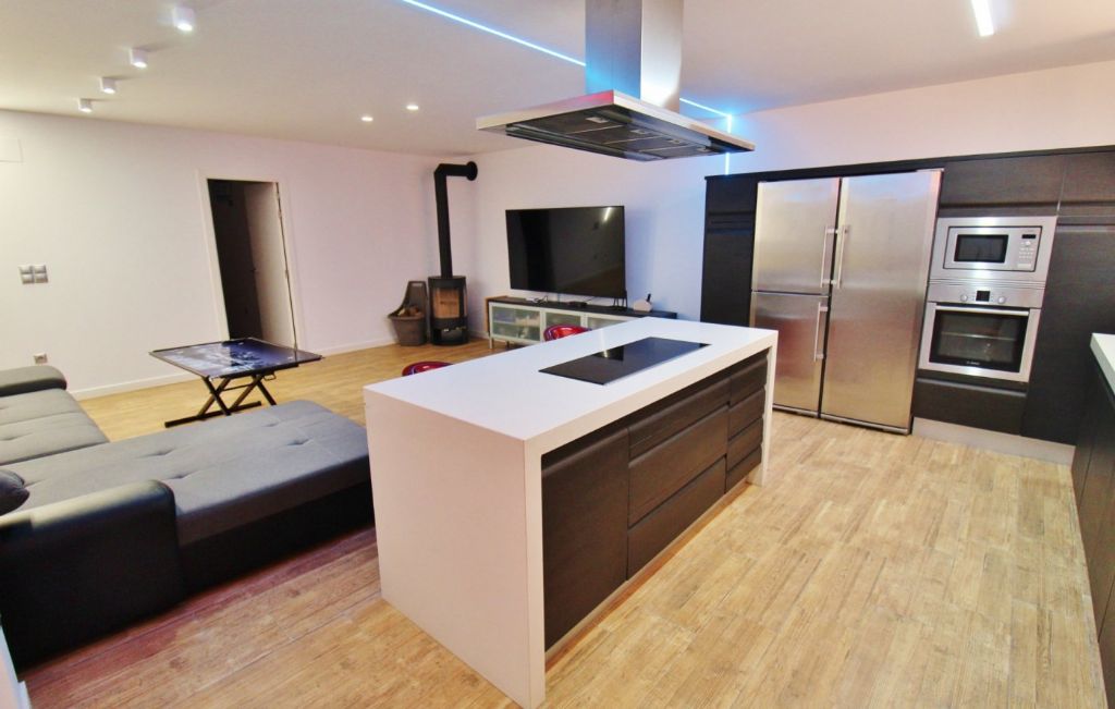 The house has 320m2 including basement, ground floor and roof terrace, 8 bedrooms, 3 bathrooms, 2 kitchens, 2 living rooms one with chimney. The basement is completely renovated and has 4 bedrooms, 1 bathroom with hydromassage bath and a living room and kitchen. On the ground floor there is a living room, a kitchen, 4 more bedrooms, 2 bathrooms and there is a large terrace of 250m2 and a covered terrace with summer kitchen and barbecue. On the roof terrace of 100m2 is a storage room of 14m2. It has a 400m2 fenced plot with pergola and there is a community pool. The house also has air condition and heating.